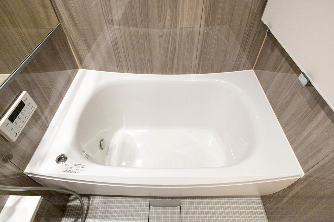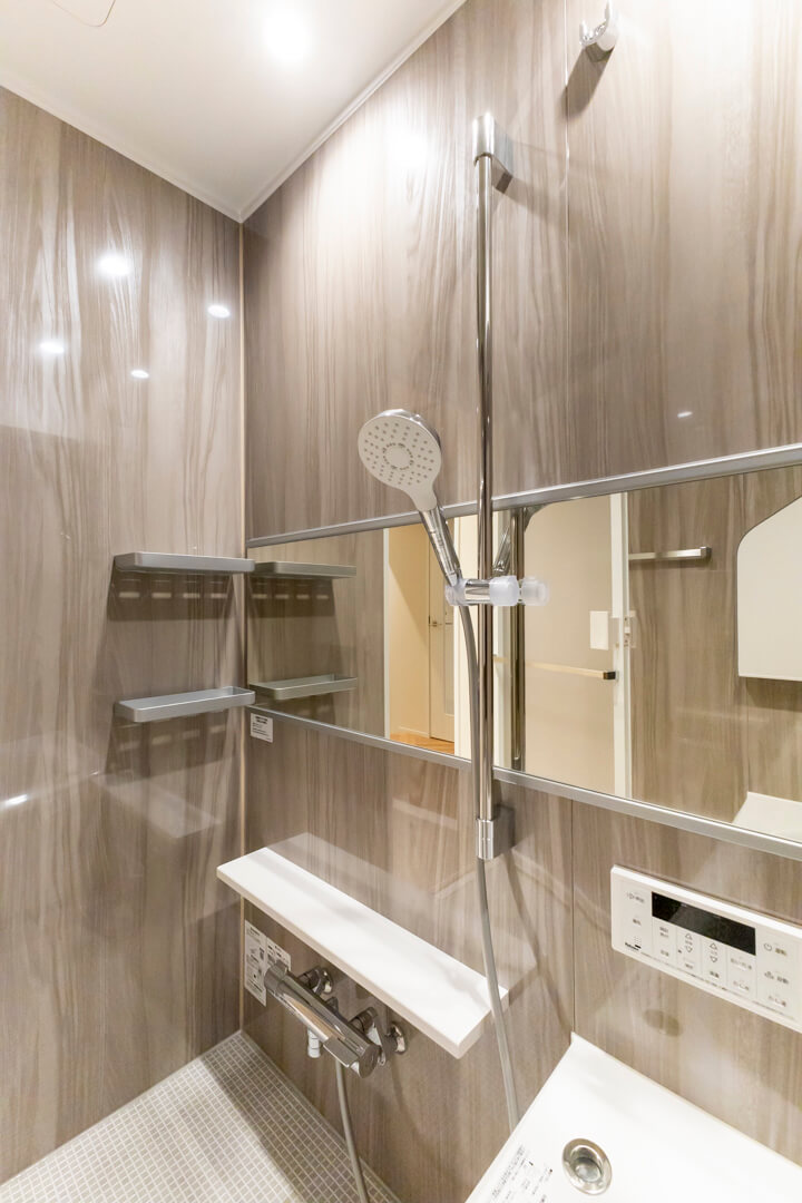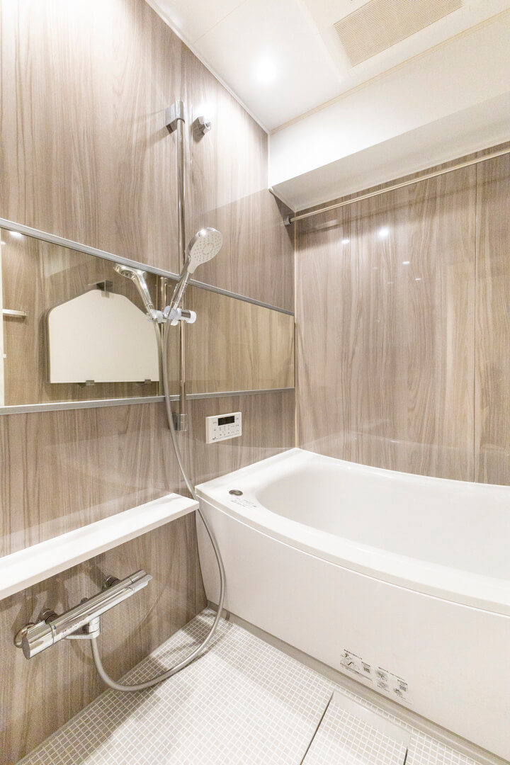 ウッド調であたたかみのある雰囲気のバスルーム。追い炊き機能の他、浴室換気乾燥機とランドリーパイプ付きで雨の日や冬場の洗濯にも困りません。