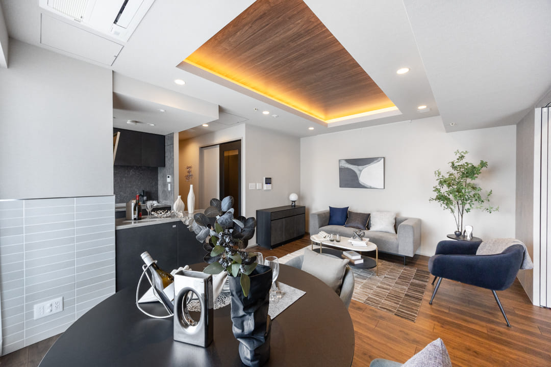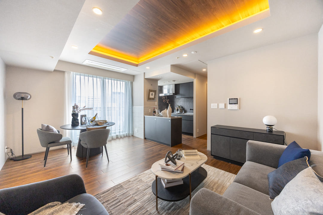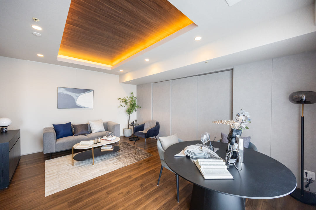 約14.1帖のリビングダイニングキッチンです。窓からはバルコニー越しに東京タワーが望めます!夜にはライトアップも楽しめそうですよ。フローリングや天井にあしらわれている木目柄が特徴的な空間。間接照明も相まって上質な雰囲気に包まれています。また、壁面にはピクチャーレールが設置されているので、壁を傷つけずに絵画などを飾ることができますよ。