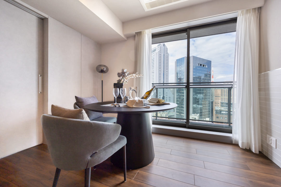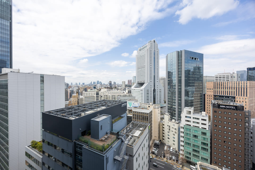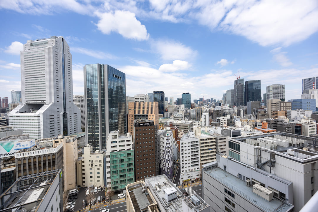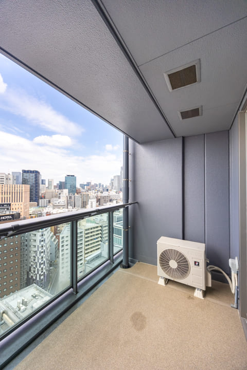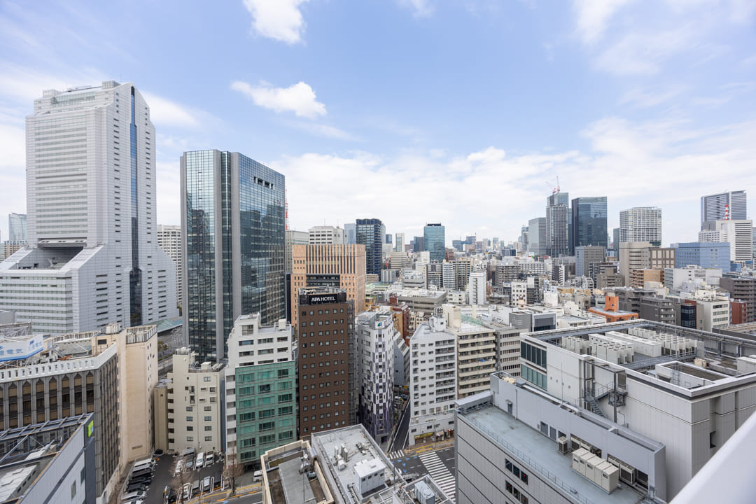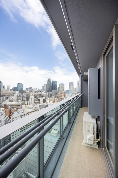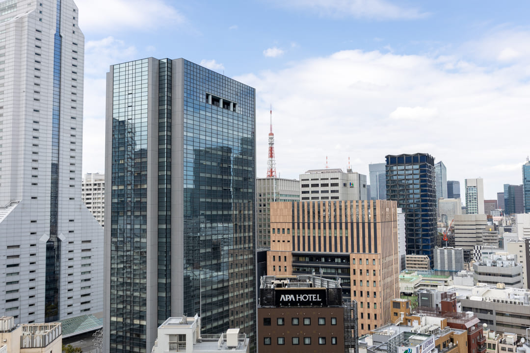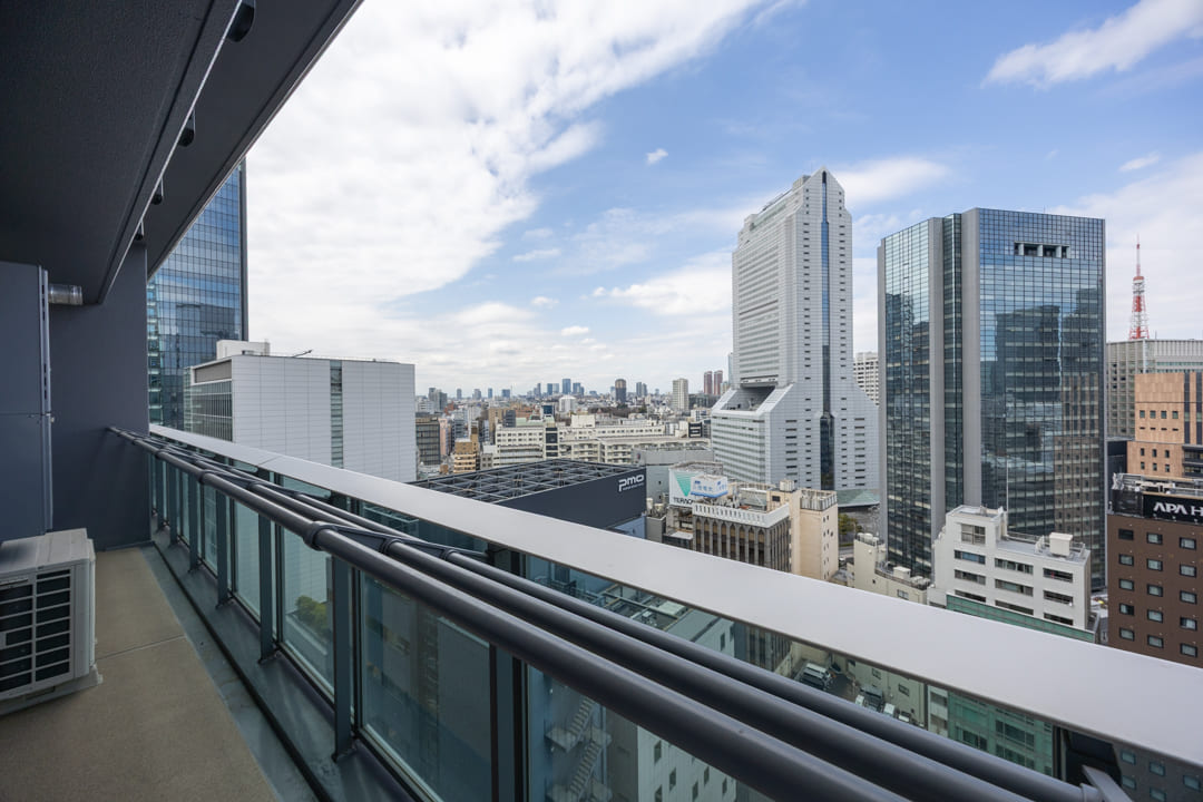 窓からは北西側のバルコニーにアクセスができます。都会的なビル群の中に東京タワーが顔を出しています。澄み渡る空の下で赤い東京タワーが街並みの中に美しく映え、周囲に広がる高層ビル群とともに洗練された都会の景色が広がります。