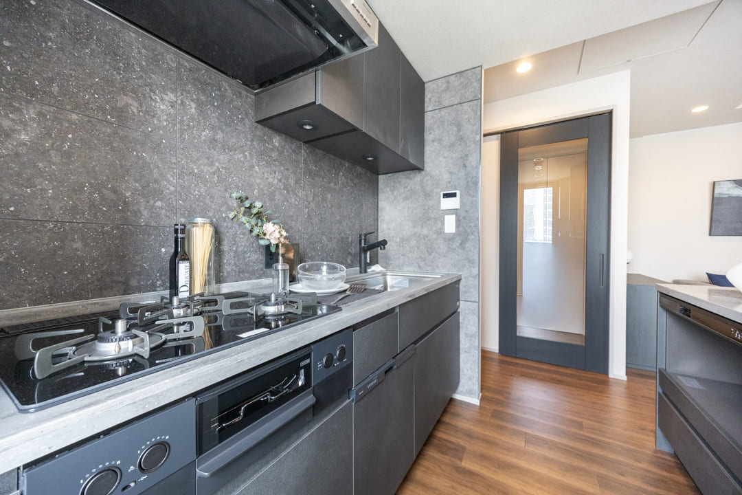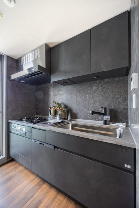 ダークカラーでまとめられたスタイリッシュなキッチンです。まるで家具のようにお部屋に馴染んでいます。横にある窓からはバルコニーにアクセスができますよ。