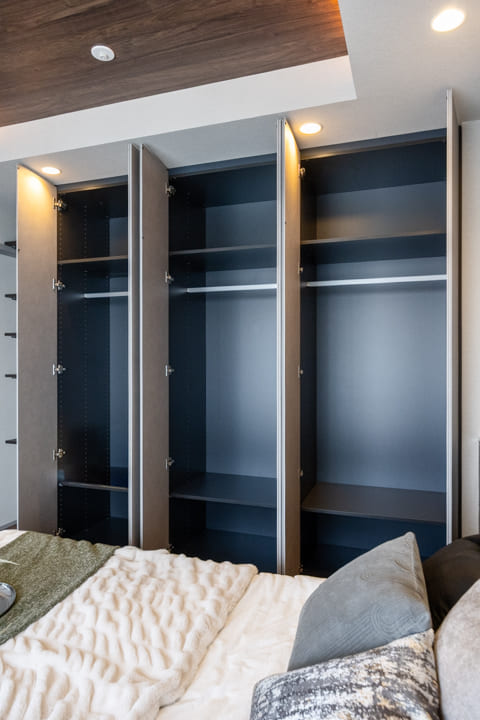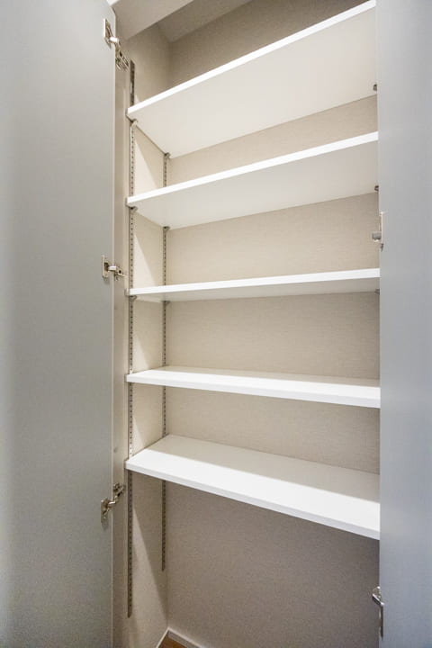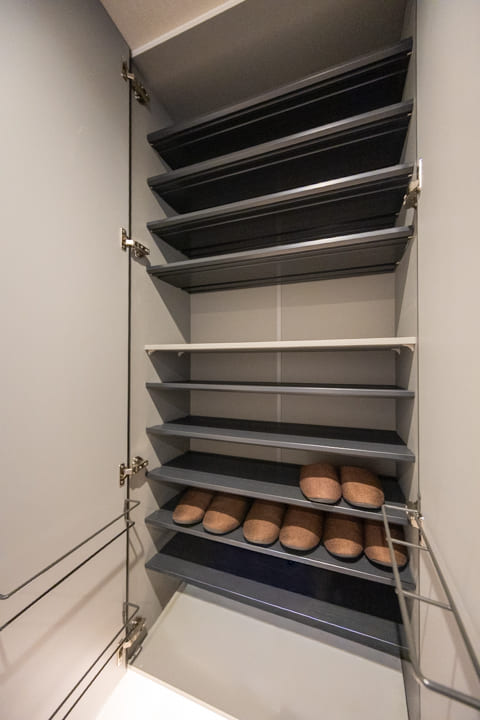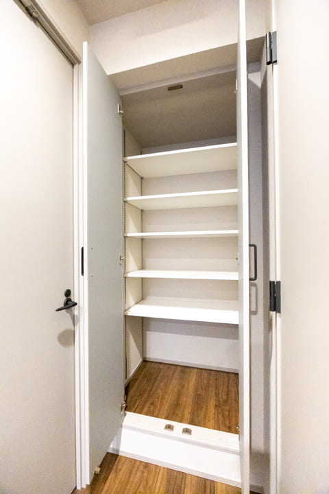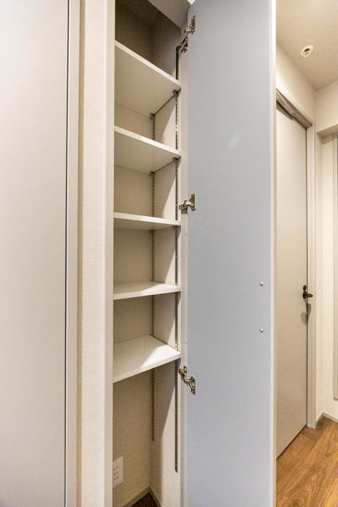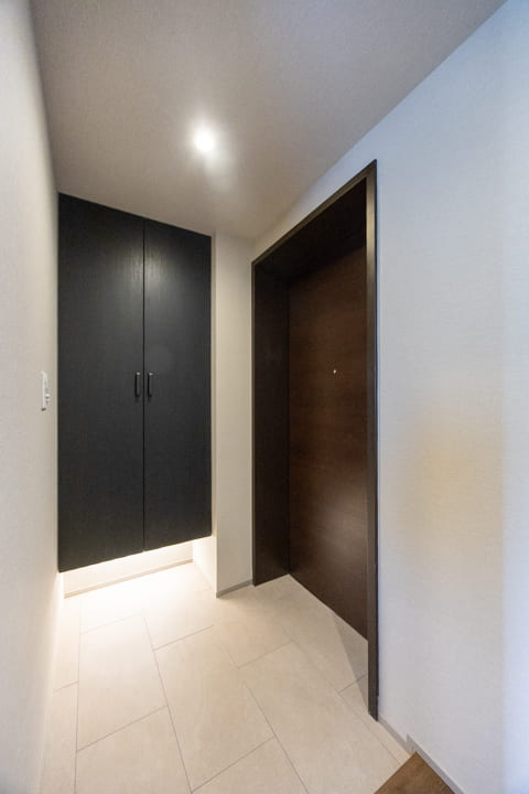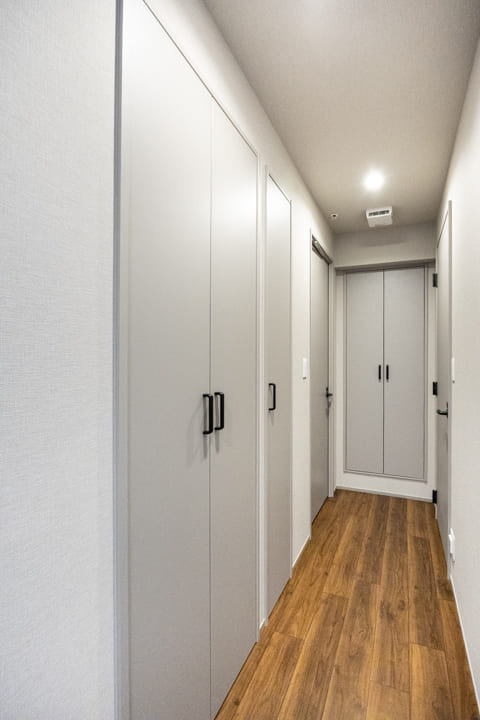 玄関にはシューズボックスが備え付けられています。高さがありますが、フロートタイプのため空間に圧迫感を与えません。フットライトの光が優しく足元を照らしてくれますよ。また、廊下にも収納スペースが豊富に造られているので、生活感が出がちな小物をすっきりと収納できます。