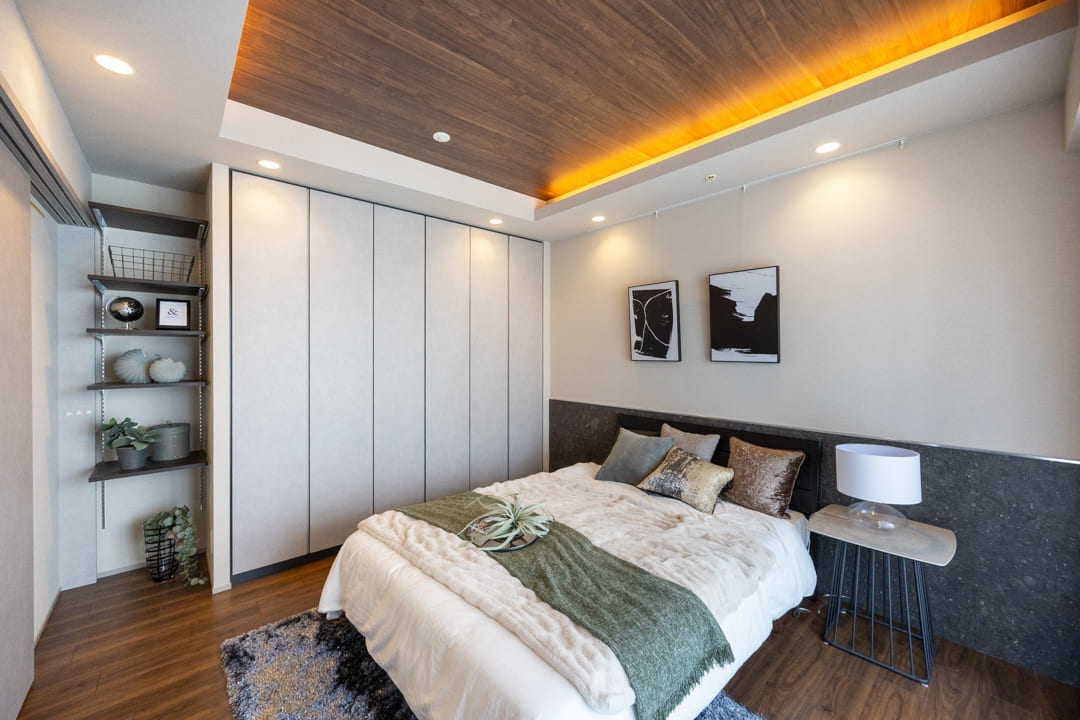 約6.9帖の洋室はリビングダイニングキッチンに隣接しています。引戸を開閉することによって、その場に応じてフレキシブルに使うことができて便利な仕様。パイプハンガーや棚板が設置されている収納力◎なクローゼットも付いています。壁面にはピクチャーレールを設置。自分好みに空間を演出できますよ。