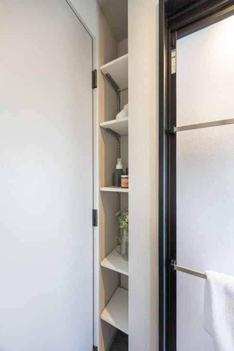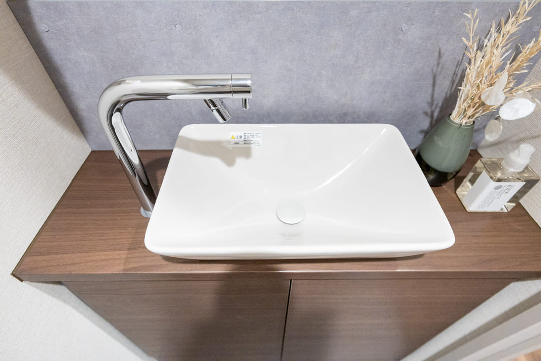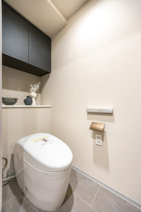 ウォシュレット一体型のトイレです。タンクレスタイプなのですっきりとした印象に。また、別途で手洗い器が造られているので、すぐに手を洗うことができて衛生的です。背面側には吊戸棚が設置されていて、収納スペースもありますよ。カウンタースペースにはアロマなどを置いても◎。