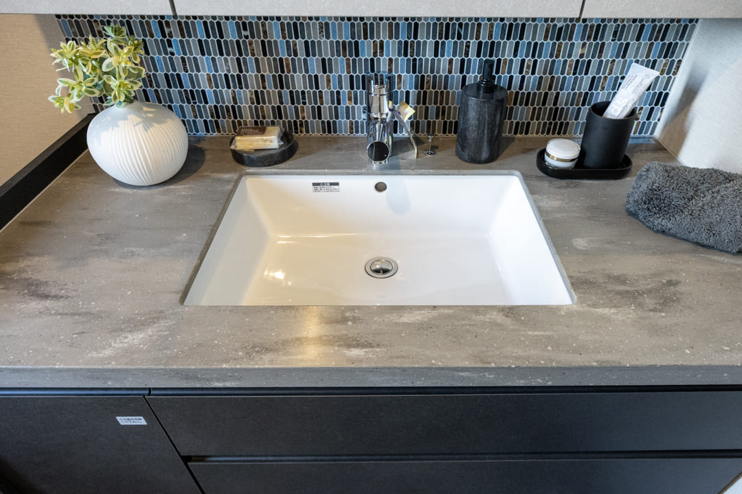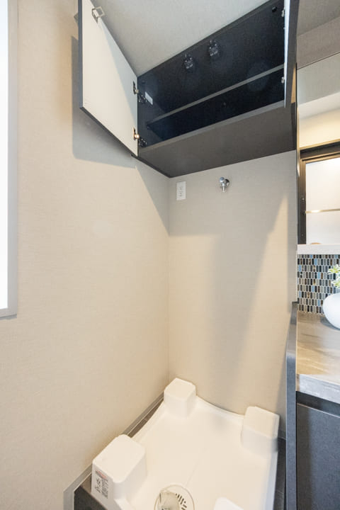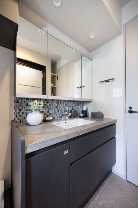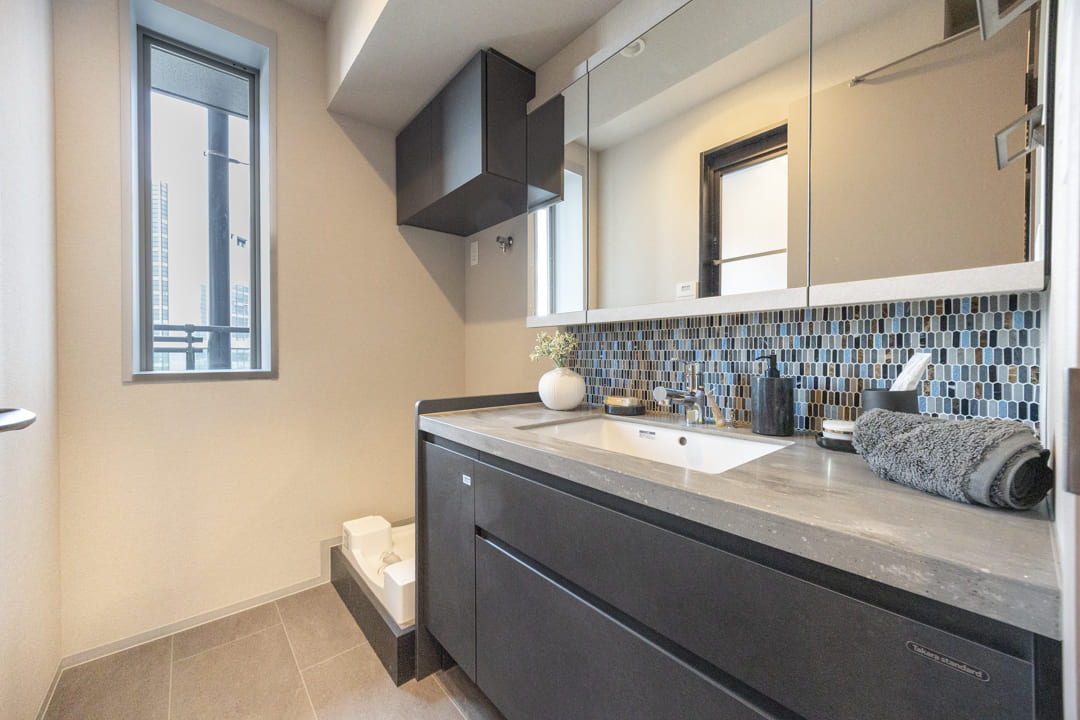 モザイクタイルがアクセントになっている洗面化粧台です。三面鏡の中に化粧品などが収納できて使い勝手良好。窓があって明るく、背面側には可動棚が造られています。