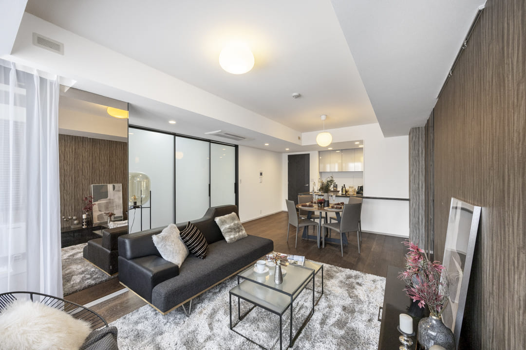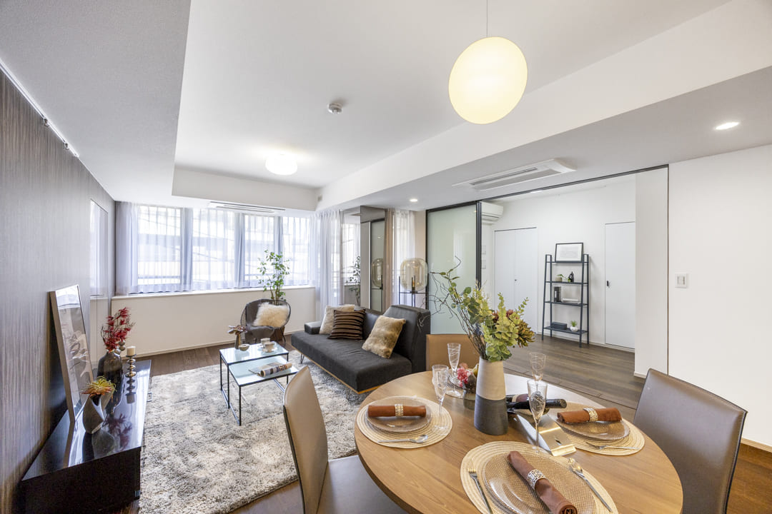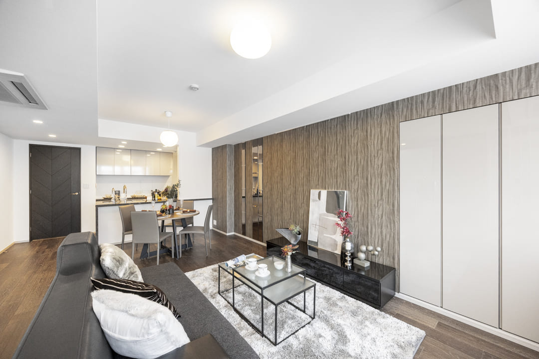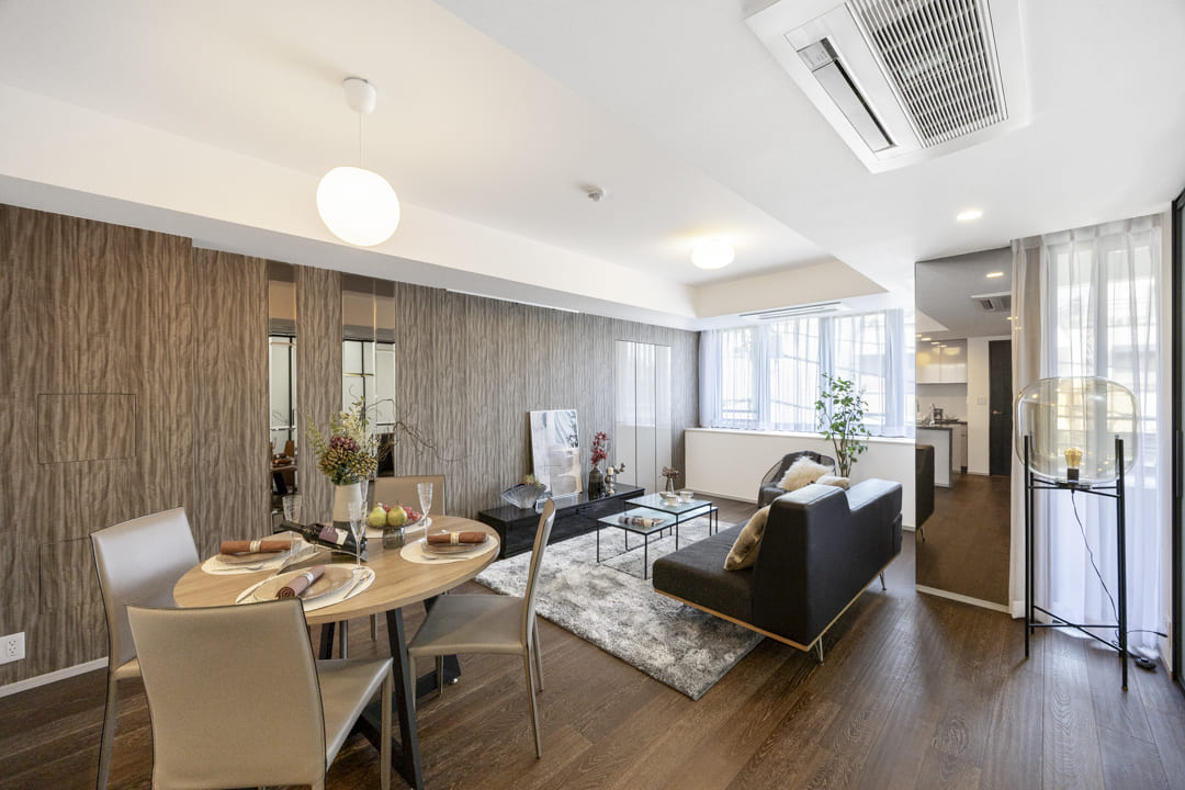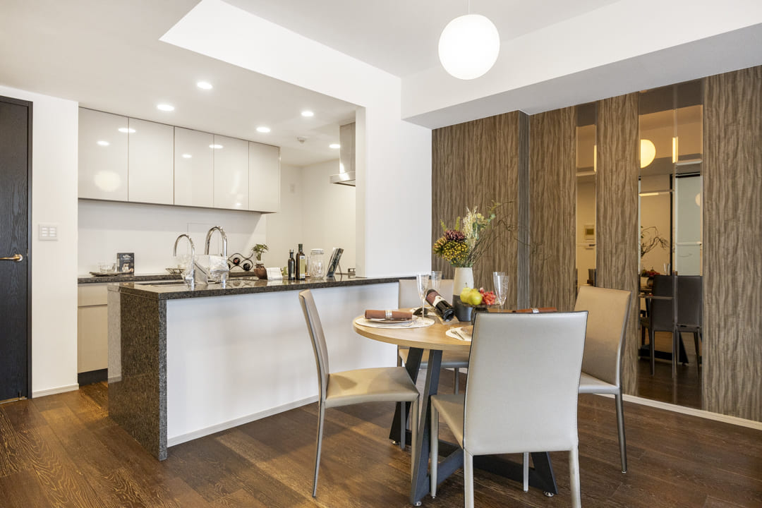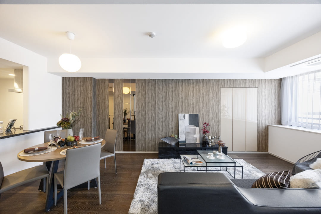 約21.0帖の広々としたリビングダイニングキッチンです。横に広がる大きな窓面からは、たっぷりと自然光が入り、お部屋全体を穏やかに包み込みます。また、木目のアクセントウォールやダークカラーの建具などが調和し、シックで統一感のあるデザインに。落ち着きの中にも上質感があり、日常を少し格上げしてくれるような雰囲気です。さらに、壁面のミラーによって空間に奥行きがプラスされています。