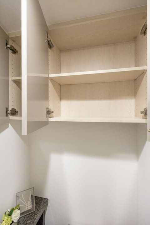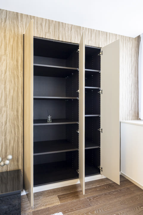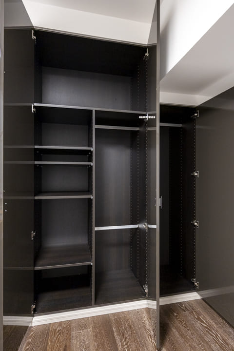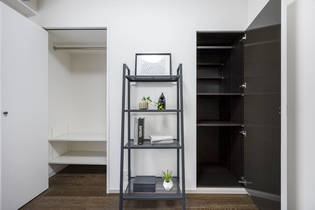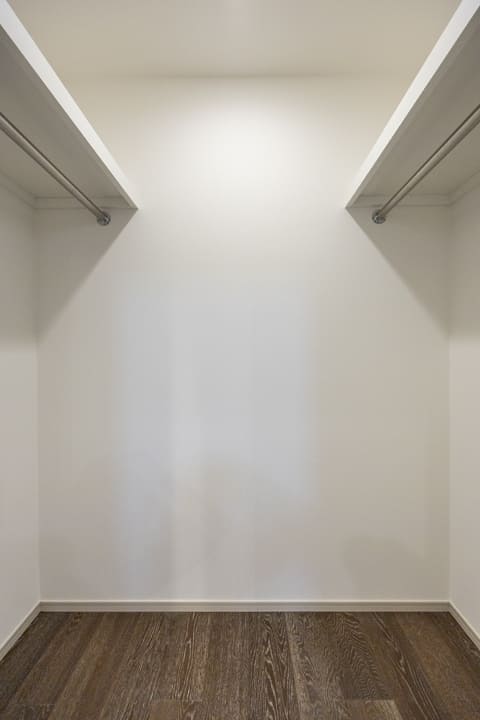 両サイドにパイプハンガーと棚板が設置されているウォークインクローゼットです。荷物をきちんと収納できると、居住スペースをより有効的に使えるので嬉しいですね。