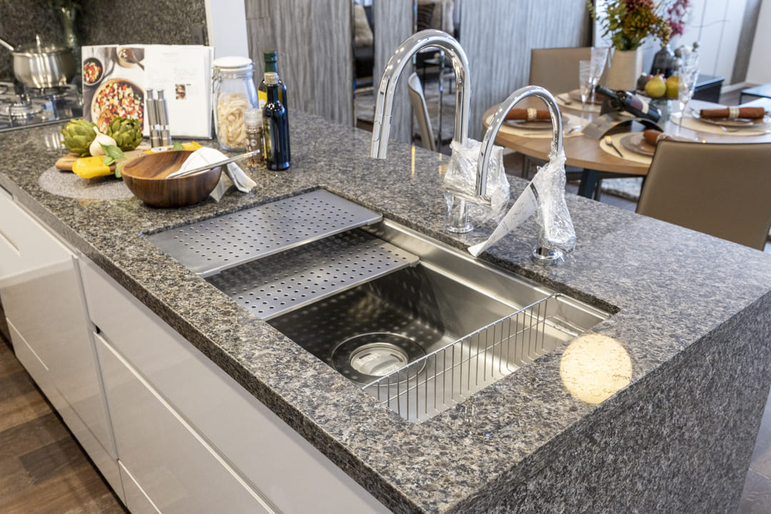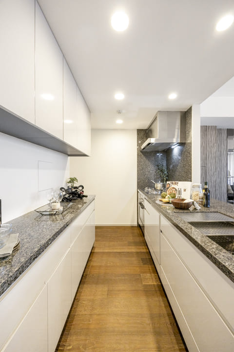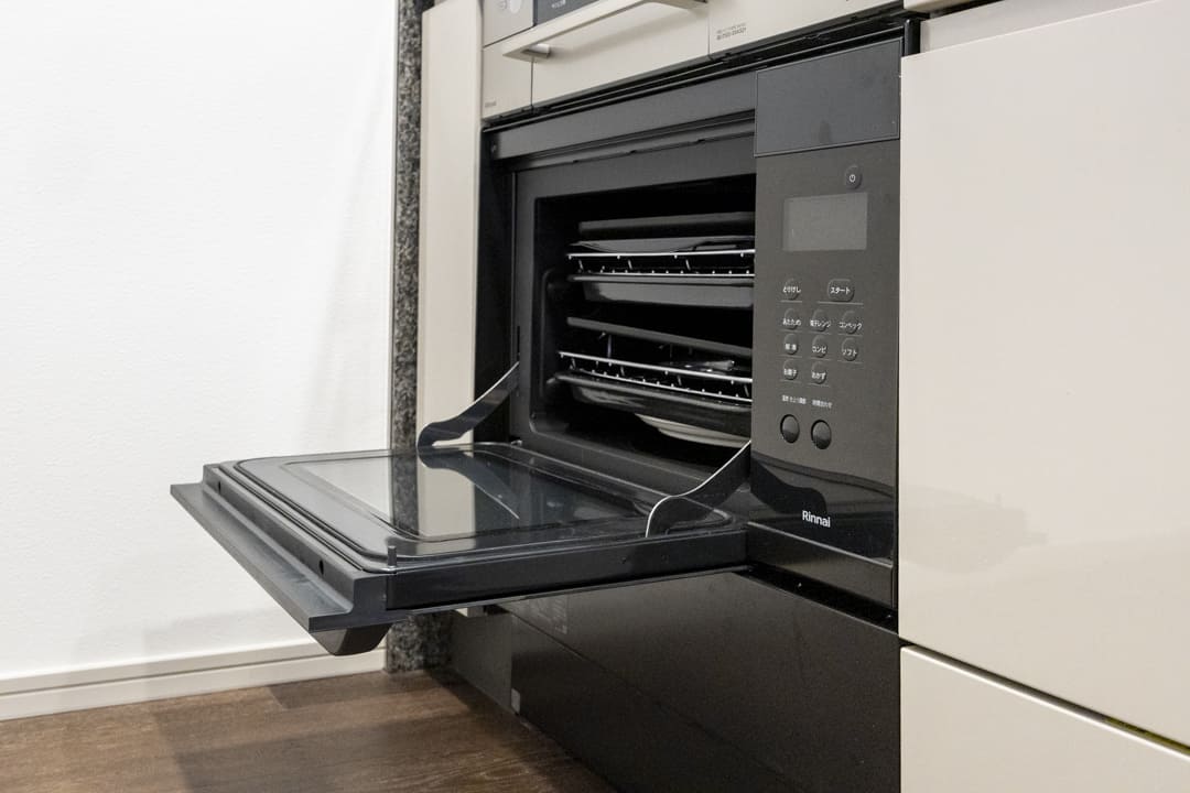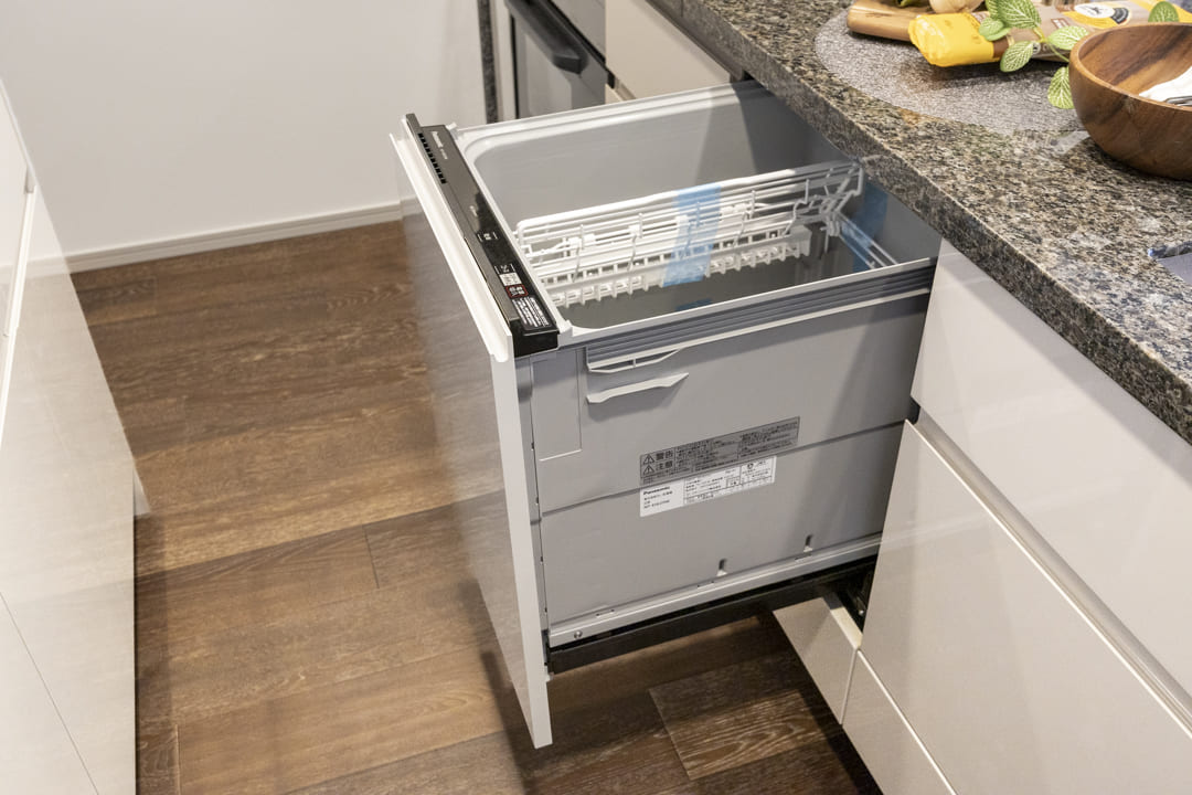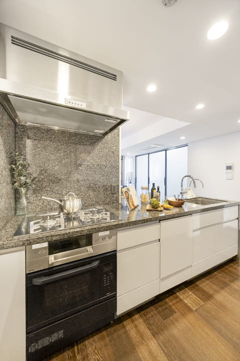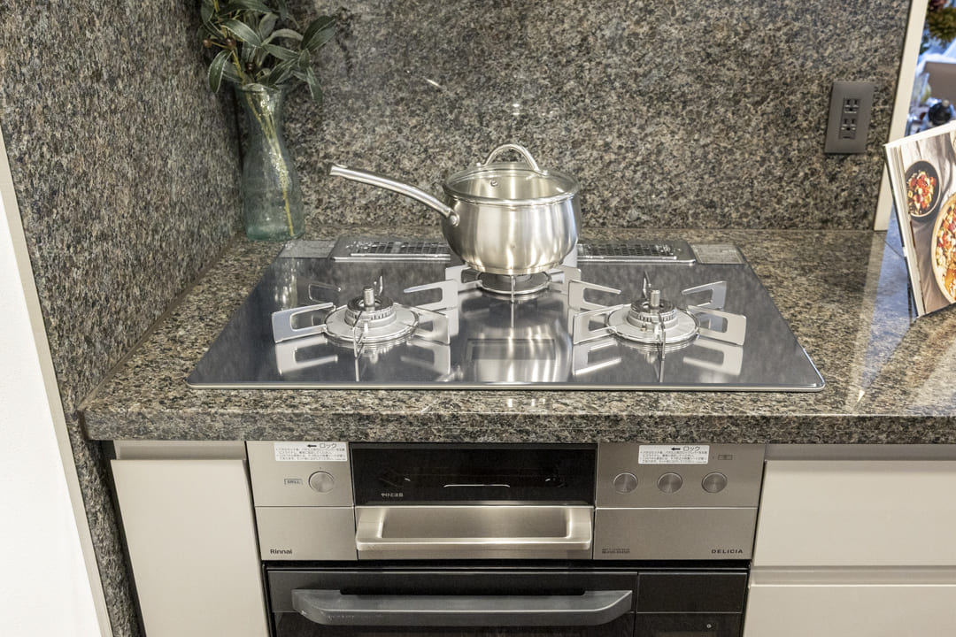 3口コンロやグリル、ディスポーザー、電子コンベック、食洗機を備え、設備面が整ったキッチンです。シンクにもゆとりがあり、食材の下ごしらえや後片付けもスムーズに行えます。