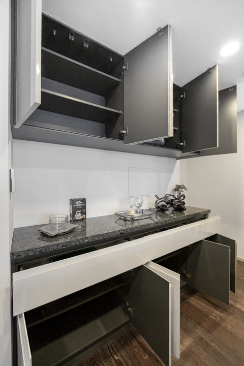 キッチンの背面側にはカップボードが備え付けられています。調味料や食器などを収納できるだけでなく、電子レンジなどを置くこともできるので便利です。