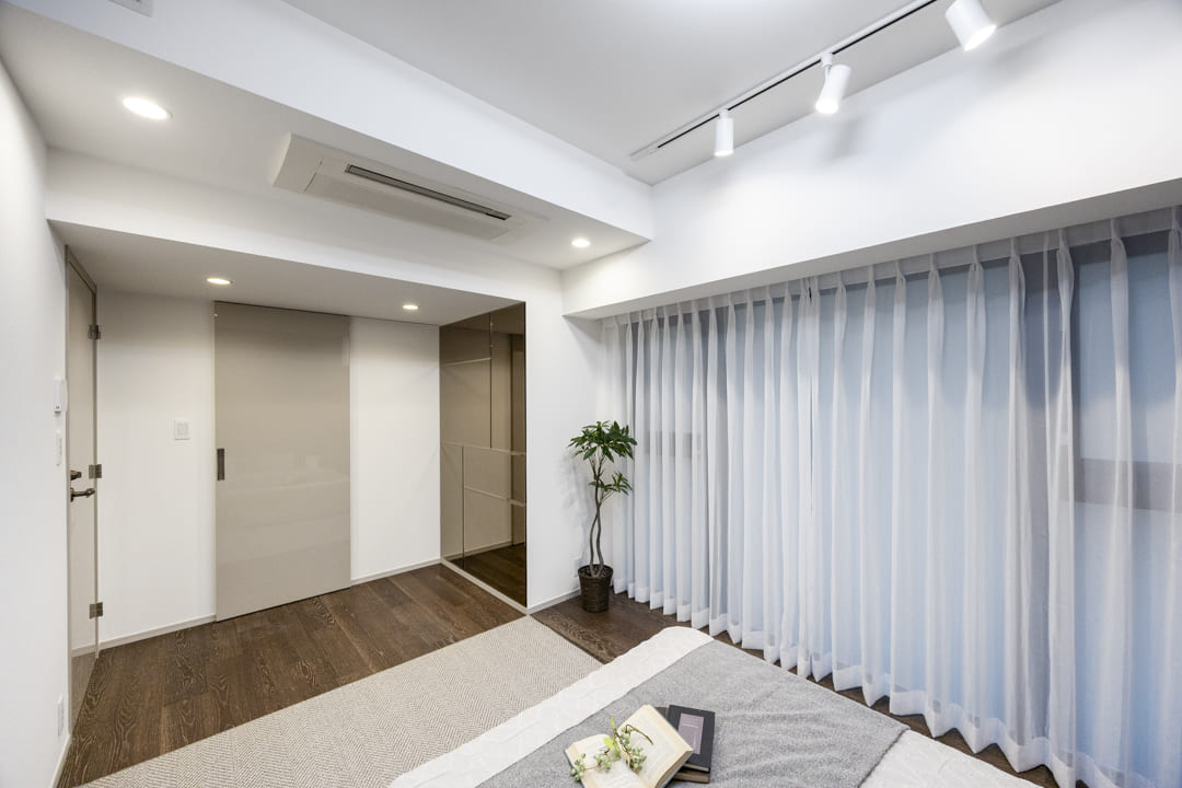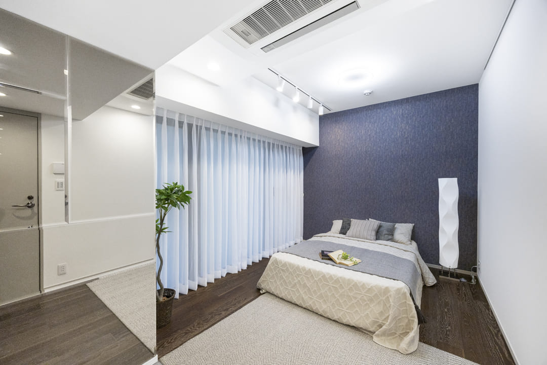 約8.0帖の主寝室は、ネイビーのクロスで空間全体を引き締めつつ、モダンで洗練された雰囲気を演出しています。また、壁面のミラーが奥行きを感じさせ、実際以上の広がりを演出。限られたスペースでも圧迫感を感じさせない工夫がされています。さらに、ピクチャーレールや床暖房も設置されていて居心地の良い空間に。