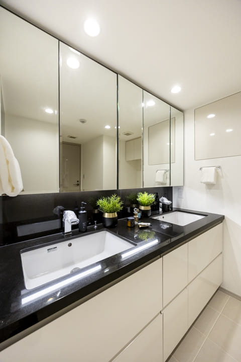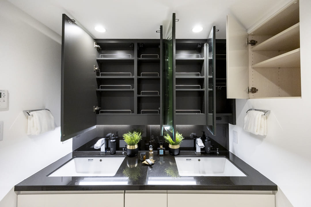 ホテルライクな2ボウル洗面の化粧台です。忙しい朝でも並んで使えるので、身支度がスムーズに行えます。また、大きなミラーボックスや壁面棚の中には化粧品などが収納できるようになっていて使い勝手も良好。入口にはリネン庫が造られているので、ごちゃごちゃしがちな洗面まわりをきちんと整頓させることができます。