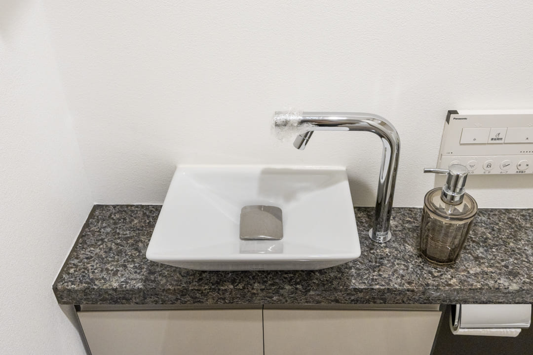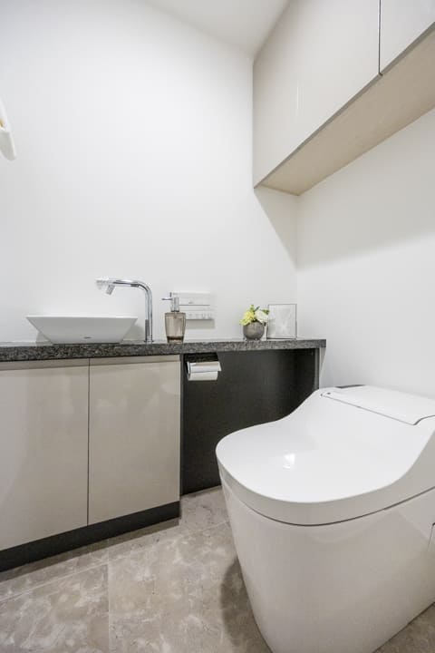 ウォシュレット一体型のトイレです。タンクレスタイプなのですっきりとした印象に。また、別途で手洗い器が造られているので、すぐに手を洗うことができて衛生的です。上部には吊戸棚が設置されていて、収納スペースもありますよ。カウンタースペースにはアロマなどを置いても◎。