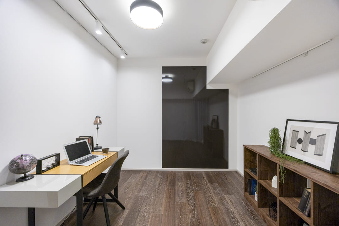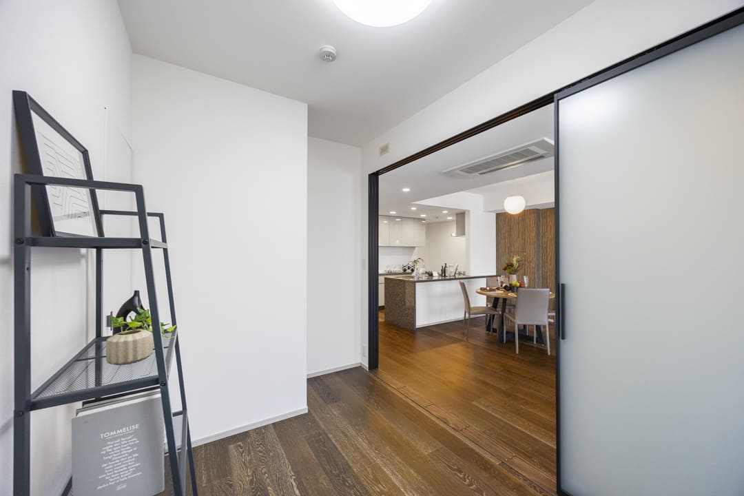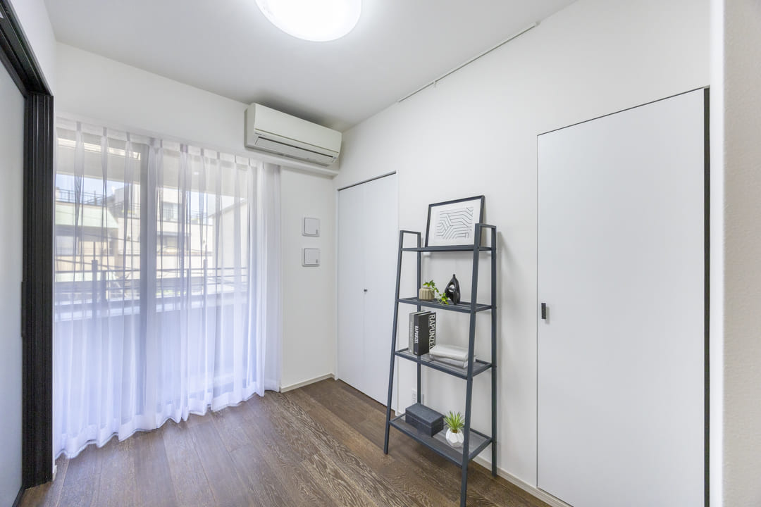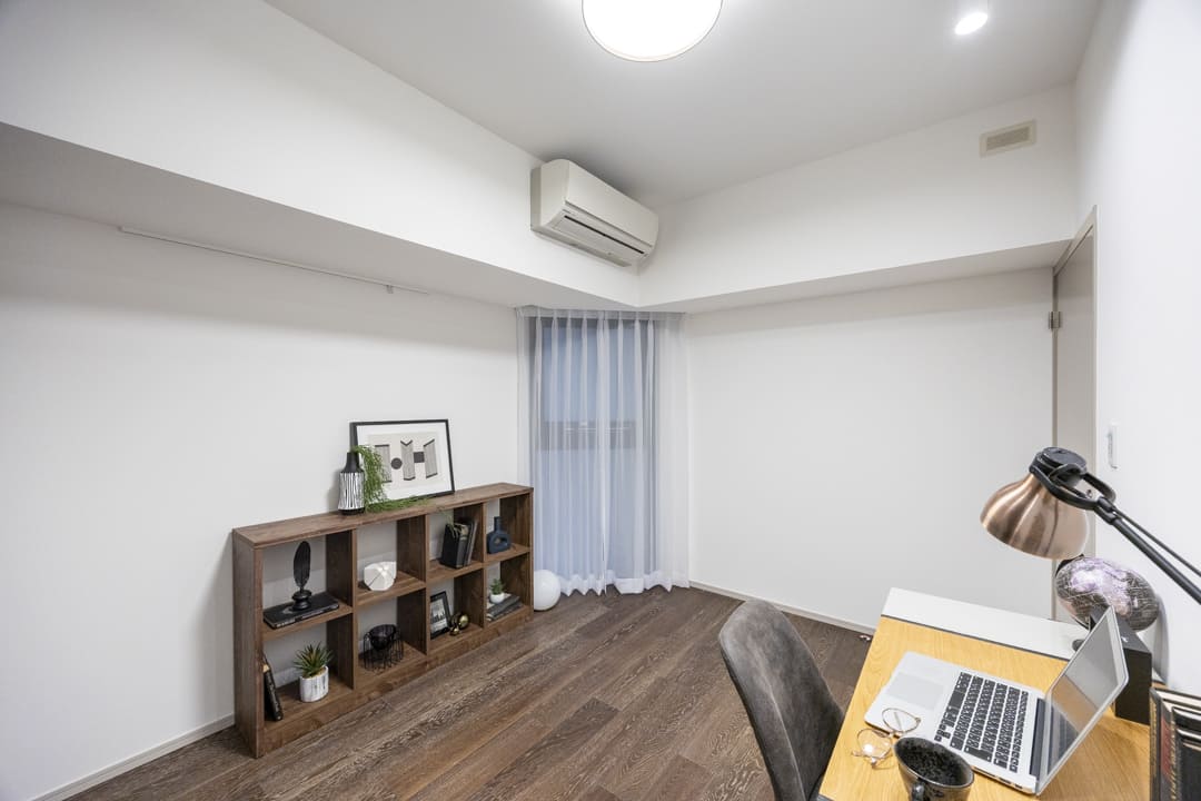 リビングダイニングキッチンに隣接している約5.3帖の寝室2です。引戸を開閉することによって、その場に応じて空間をフレキシブルに使うことができます。書斎やリモートワークなどにもぴったりな空間です。壁面にはピクチャーレール付きで、収納スペースも確保されていますよ。