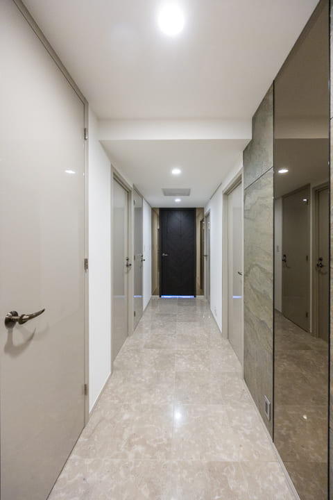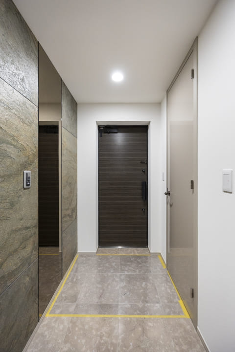 ストーン調の壁や石張り仕上げのフロアが高級感を漂わせている玄関ホールです。入って左側にはシューズインクローゼットがあり、たくさんの靴を収納することができます。さらに、廊下には納戸が造られているため、アウトドアグッズや大きめの荷物もすっきりと収納することが可能です。
