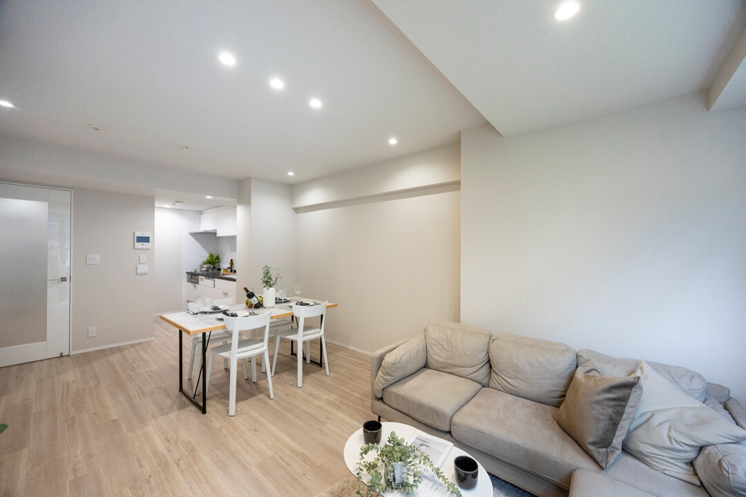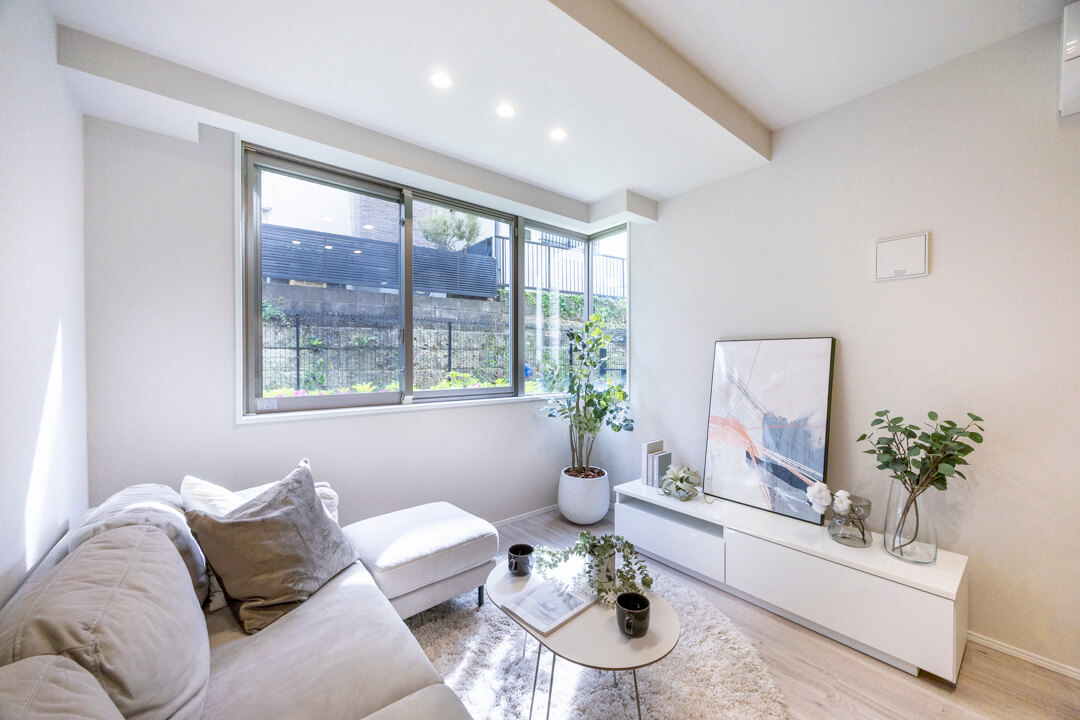 キッチンスペースを含め、約15.4帖のLDK。シンプルでナチュラルな空気感です。自然な光が入る南向きで、コーナーサッシからは心地よい陽が入ります。窓は専用庭に面しています。