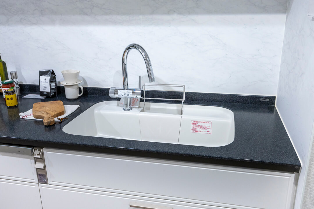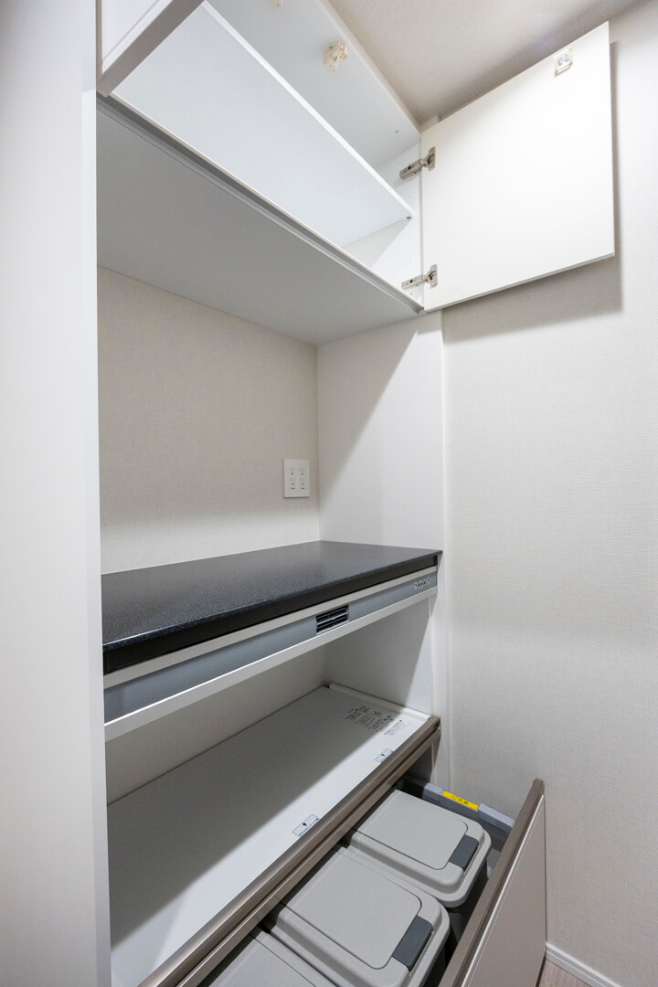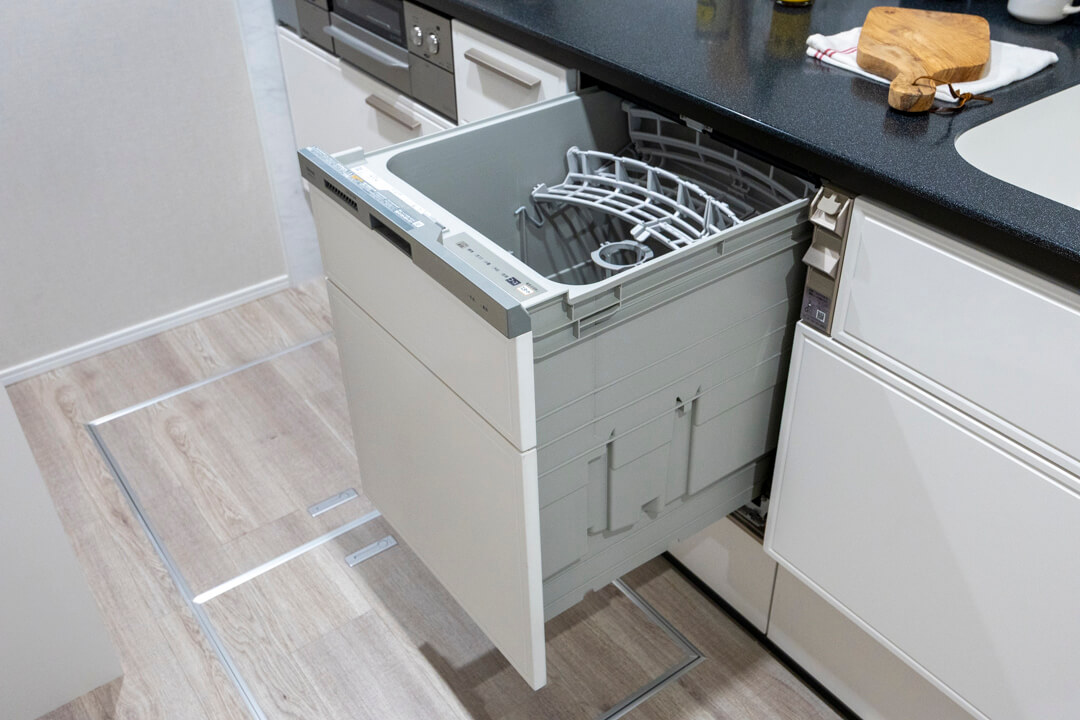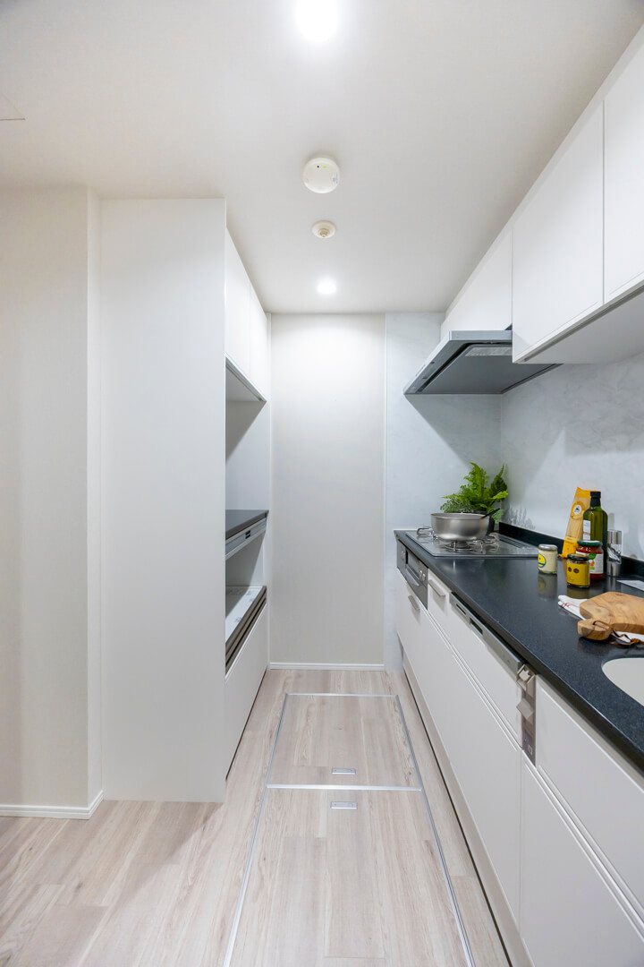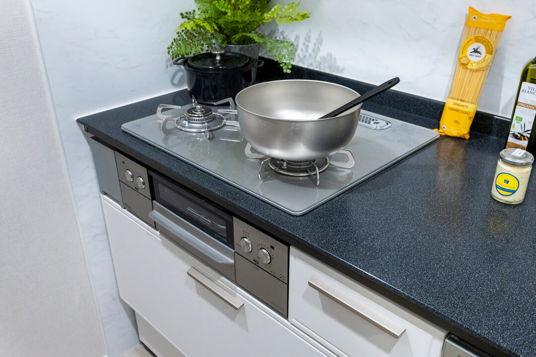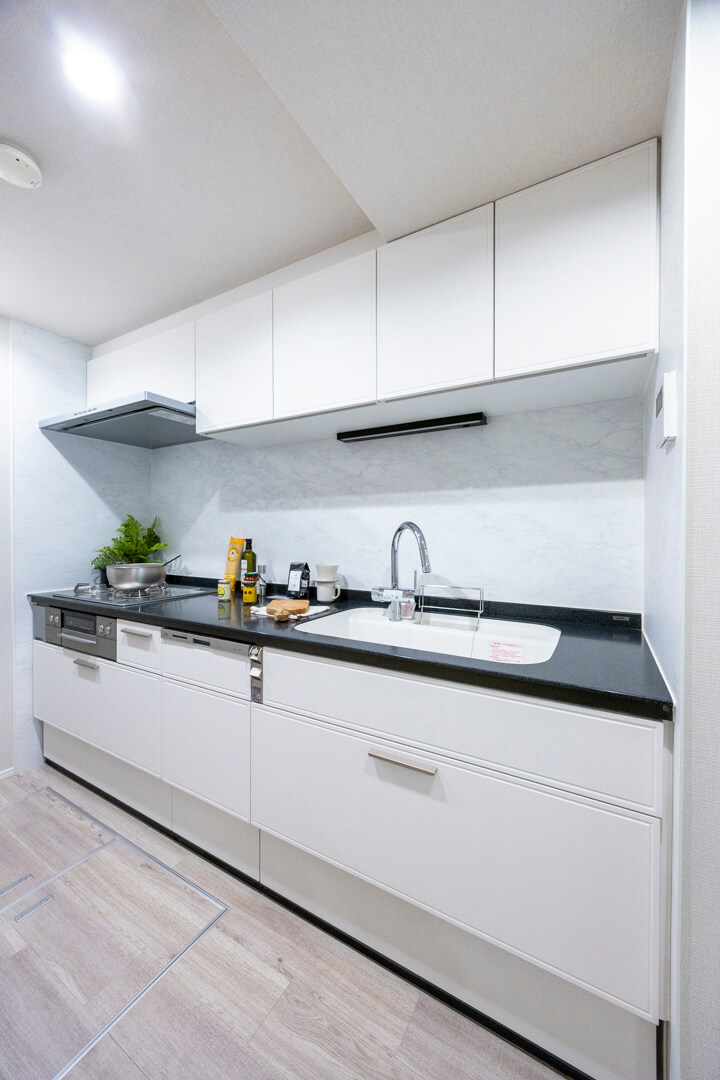 明るい印象を与えてくれるホワイトカラーのシステムキッチン。リビングダイニングとゆるやかにゾーニングされていて、生活感をさりげなく目隠しできます。料理が捗る3口ガスコンロ、家事の時短に心強い食洗機付き。カップボード、床下収納付きで収納スペースもしっかり確保されています。