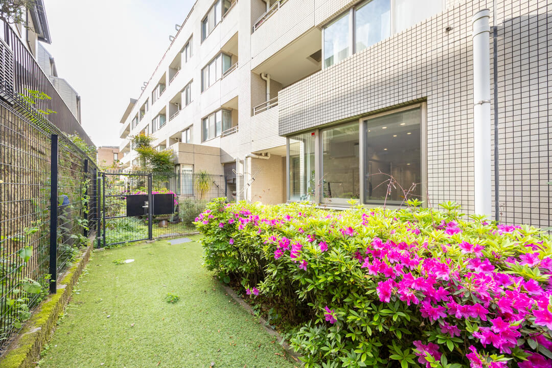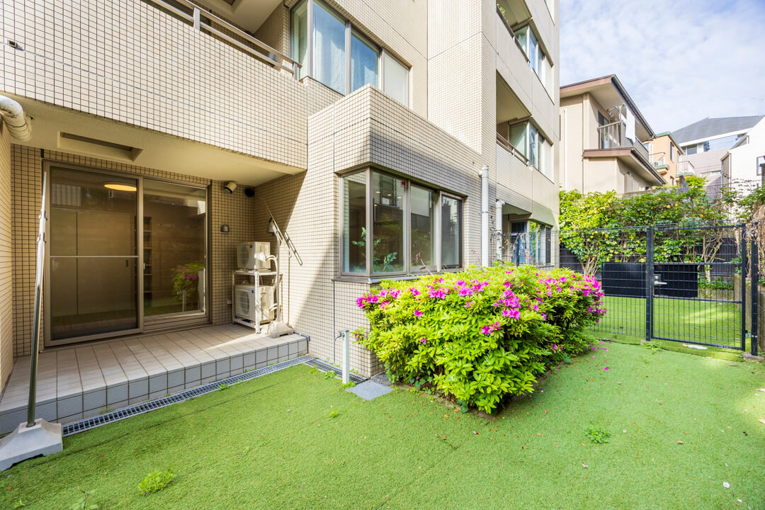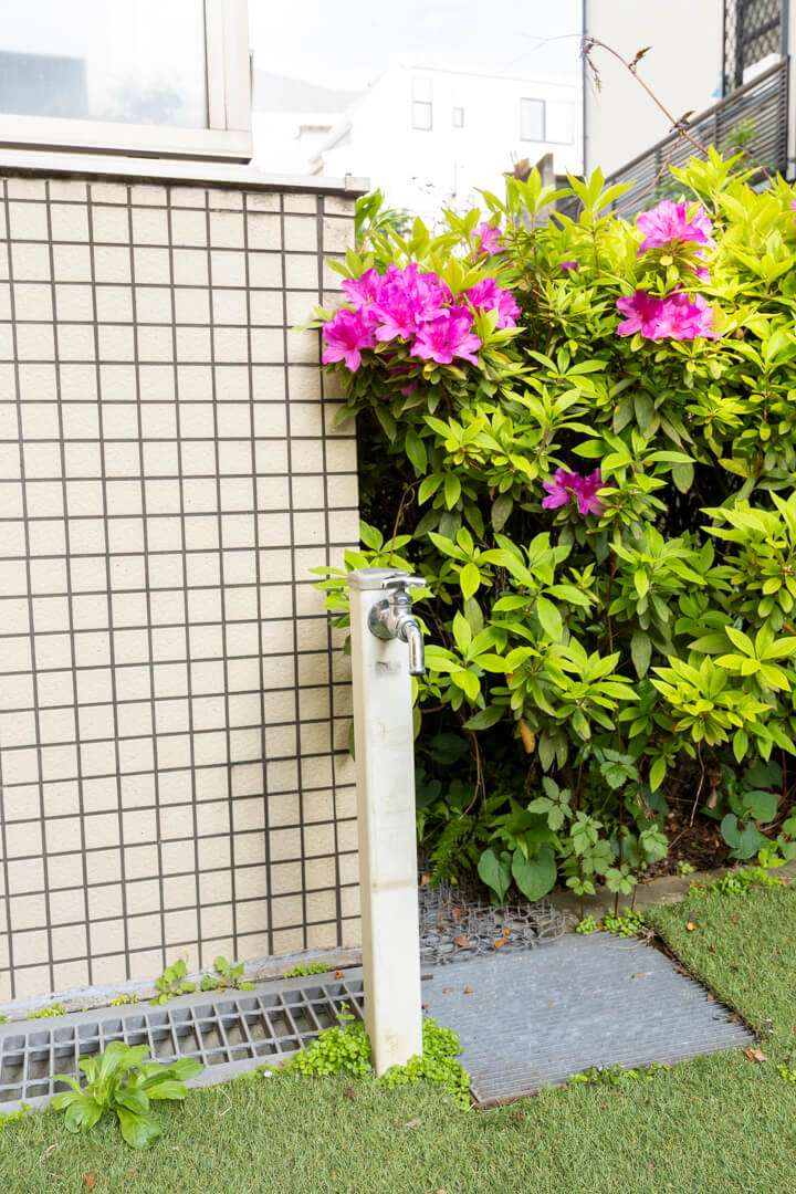 洋室に面した約5.60㎡のテラス。南向きで陽当り良好、洗濯金物も設置されています。その他奥には約25㎡のゆとりある専用庭が広がっています。つつじが植えられており、春には華やかなピンク色の花が楽しめます。植物の水やりにも便利な蛇口も付いています。