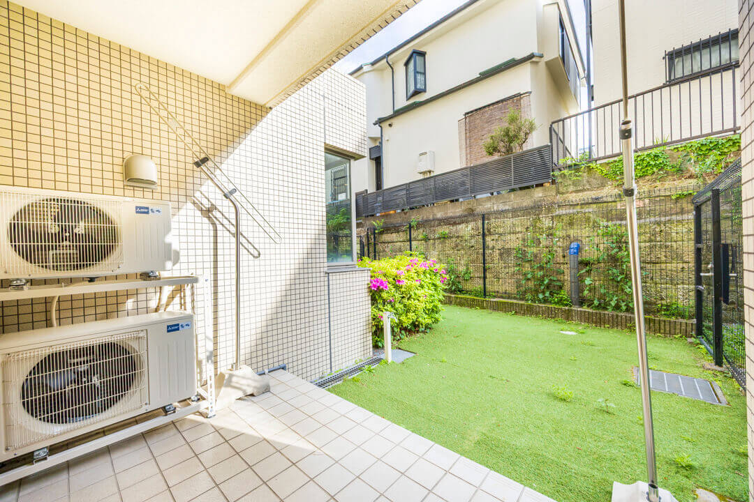 東京メトロ銀東西線「神楽坂」駅から徒歩8分。今回ご紹介する物件は約65㎡の2LDKです。1階部の特権、テラス+専用庭が付いています。専用庭は約25㎡のゆとりのある広さ。南向きで陽当たりも良好で、植物の水やりなどに便利な蛇口も備わっています。LDKも15帖超えのゆとりのある広さ。玄関にはSIC(シューズインクローゼット)も設けられています。