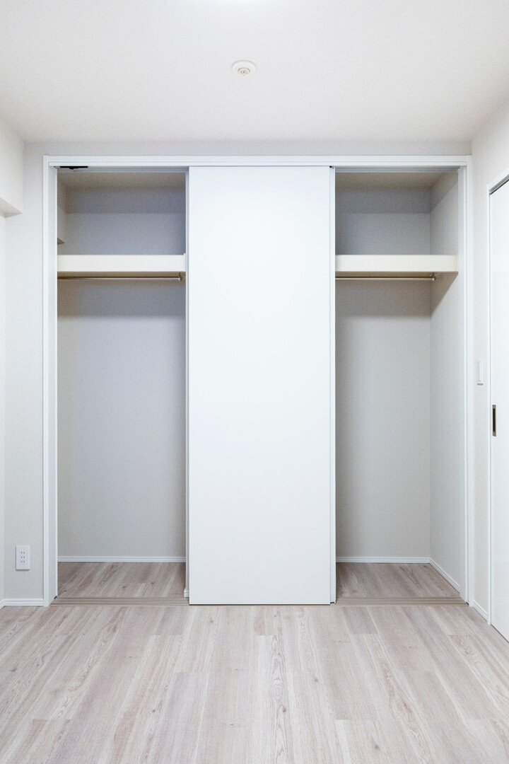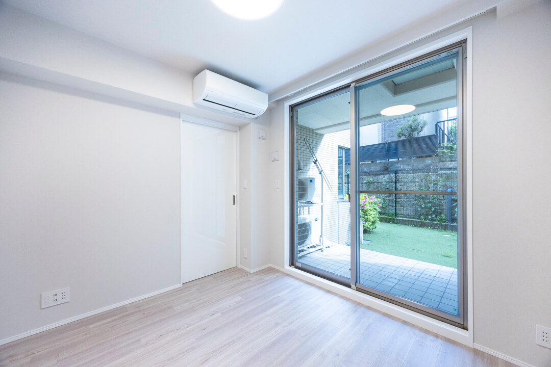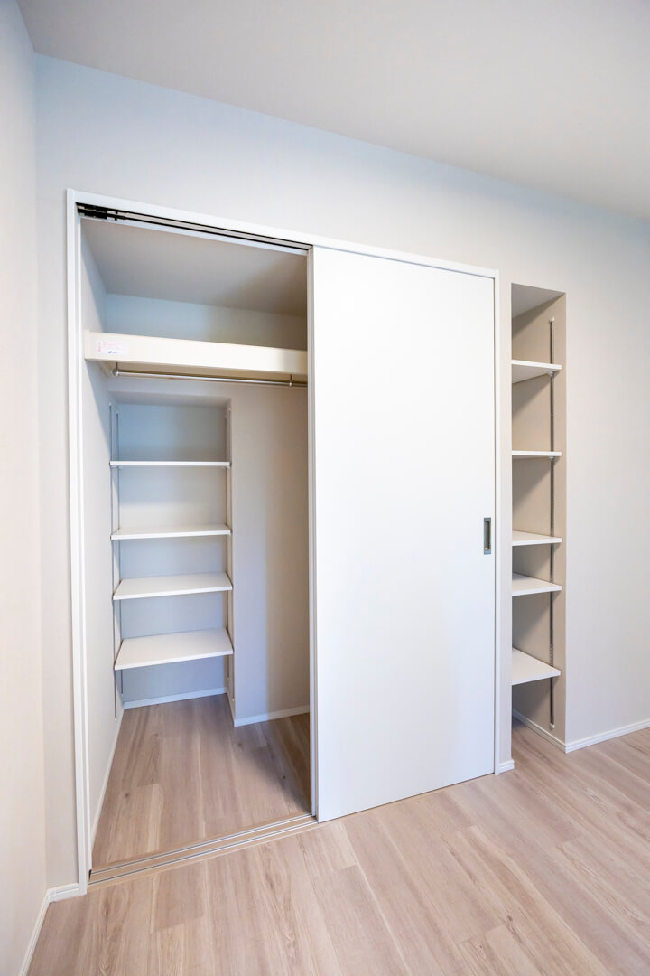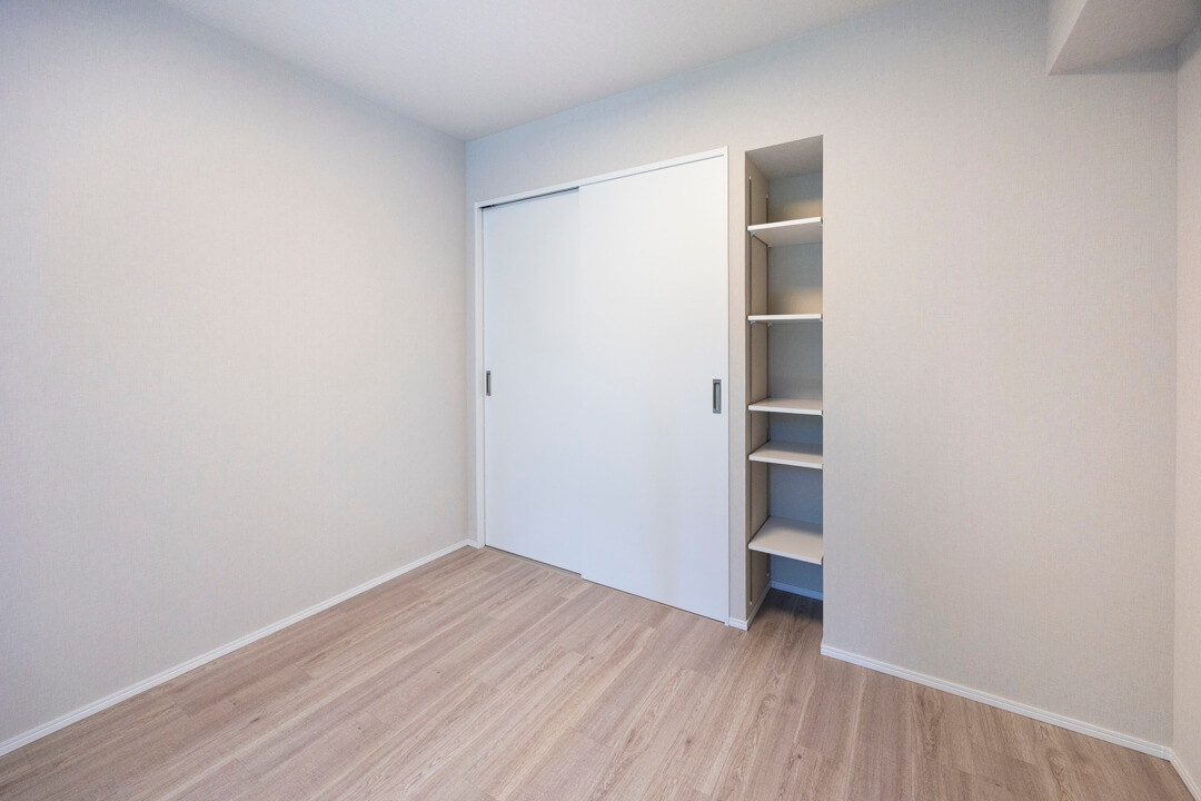 約5.8帖の洋室。テラスへの出入りができ、庭の緑が望める心地よい眺め。クローゼット内には可動棚が設置されていて、バッグなどの小物置きにも困りません。また、別途、可動棚も備わっています。本棚や飾り棚として使うのもいいですね。