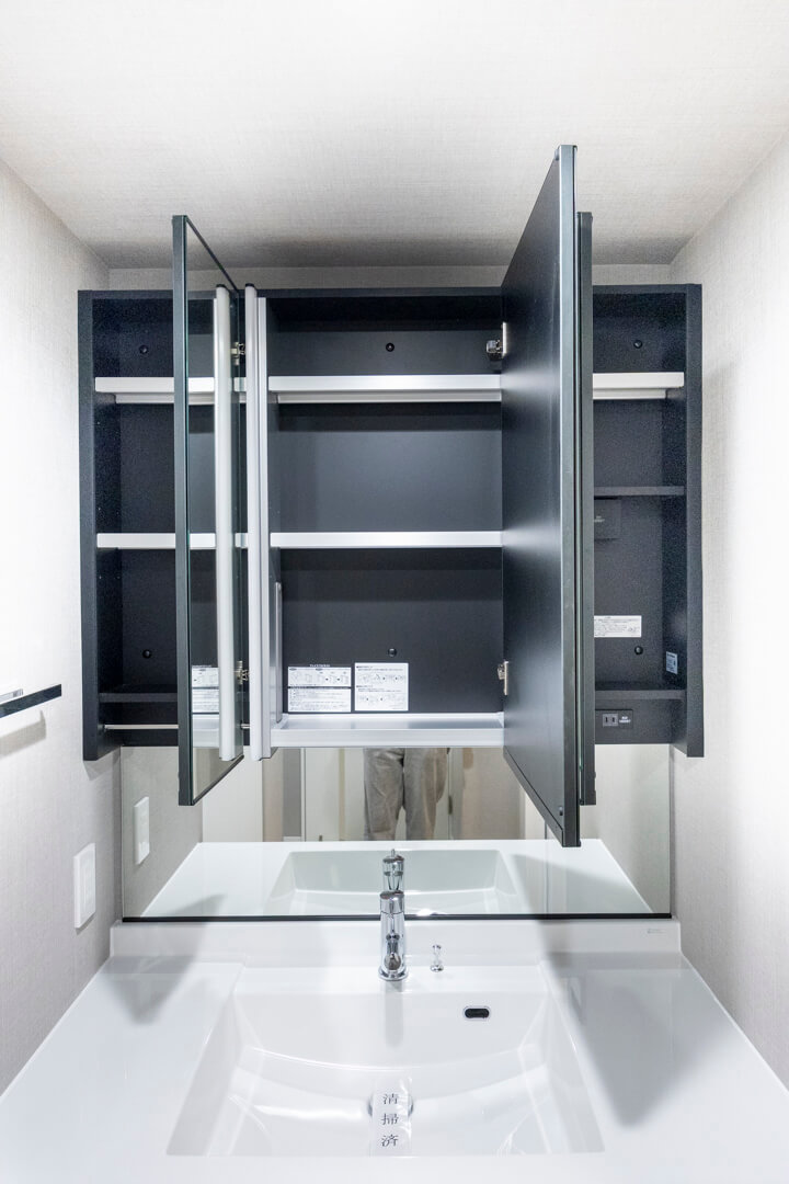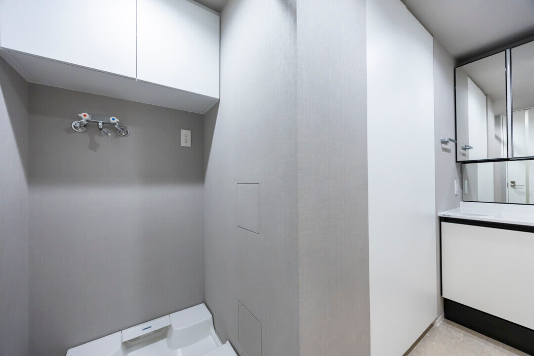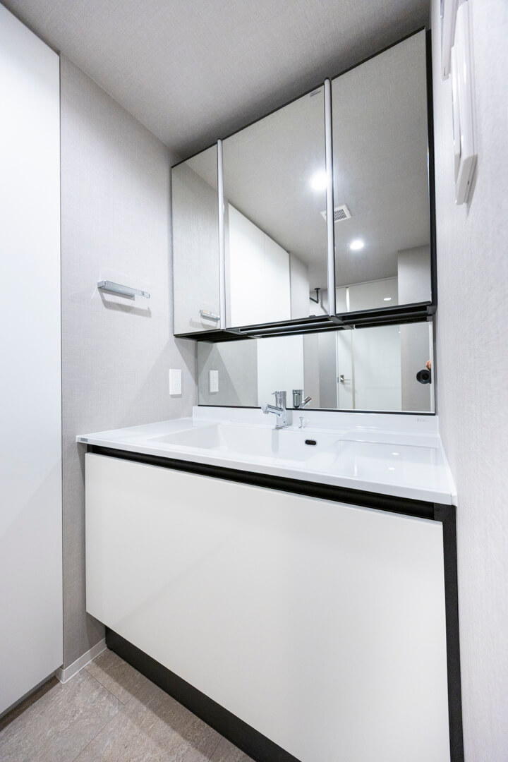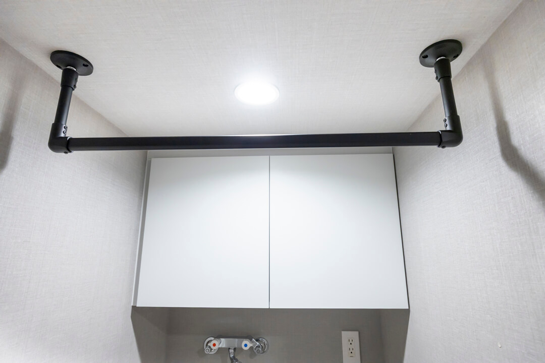 洗面化粧台は洗面まわりの小物がすっきり整頓できるミラーボックスや、モノの出し入れがしやすい引き出し式のキャビネット付きで使い勝手の良さもポイント。洗面台とは別途、大容量のリネン庫も設置されていて、収納スペースが充実しています。また、洗濯機置場の天井部にはハンガーパイプが設置されています。浴室だけでなくこちらにも洗濯物を干すことができます。