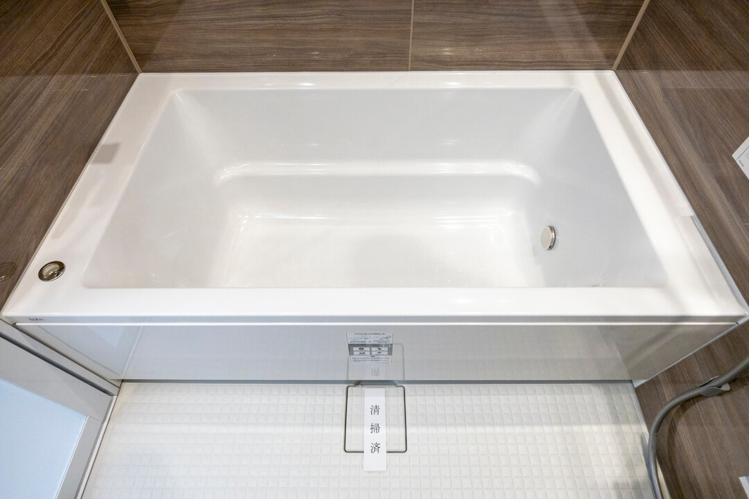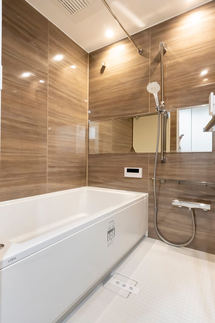 ウッド調であたたかみのある雰囲気のバスルーム。1416サイズです。追い炊き機能の他、浴室乾燥・衣類乾燥・換気・暖房の機能が備わっていて、一年中快適にバスタイムが楽しめます。ハンガーパイプも設置されていて、雨の日や冬場の洗濯にも困りません。