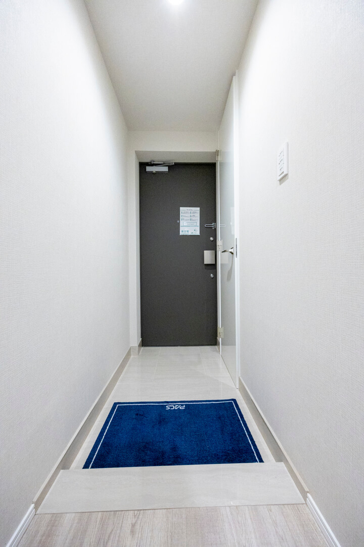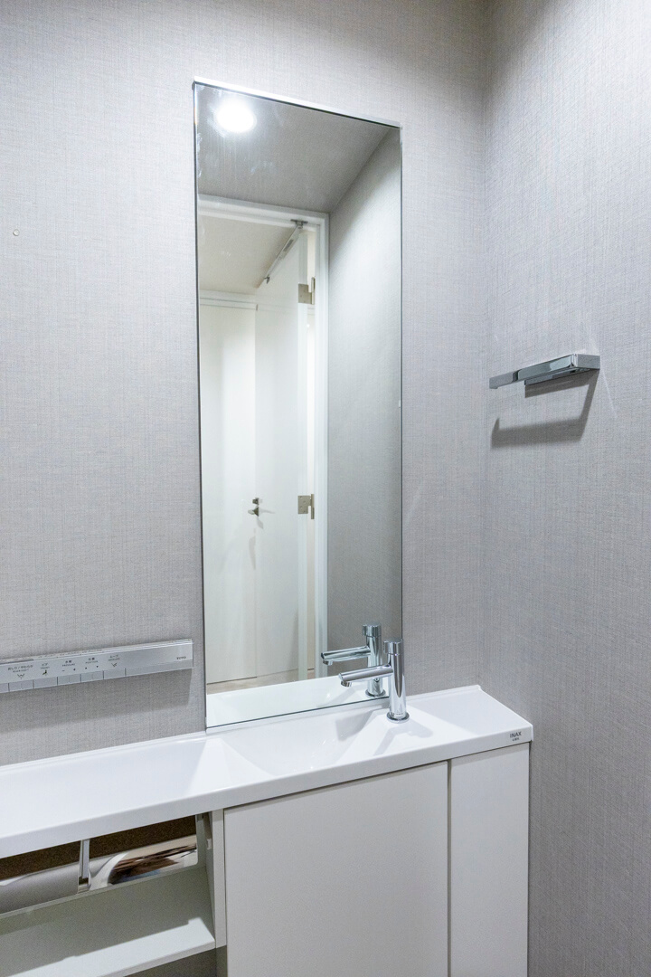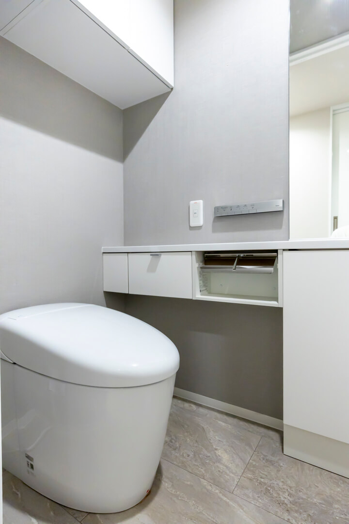 廊下に面したレストルーム。空間がすっきり見えるタンクレストイレです。手洗いカウンター、ウォシュレット、収納スペースも備わっています。