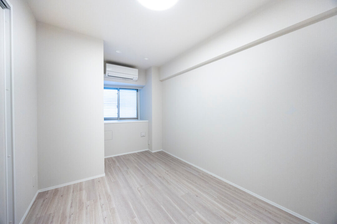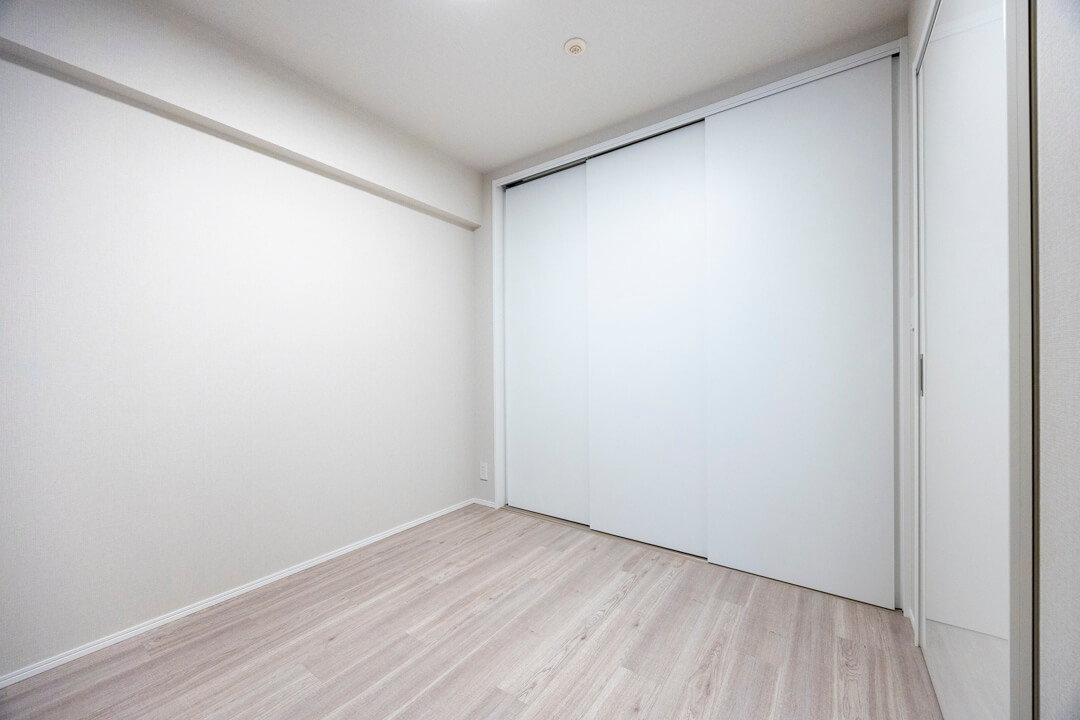 約6.4帖の洋室。廊下に面した独立性の高い空間で、自分時間をゆっくりと過ごせます。窓際にはカウンターが付いていて、植物やアートなどが飾れます。3枚扉のクローゼット付きで洋服もたくさん掛けることができます。