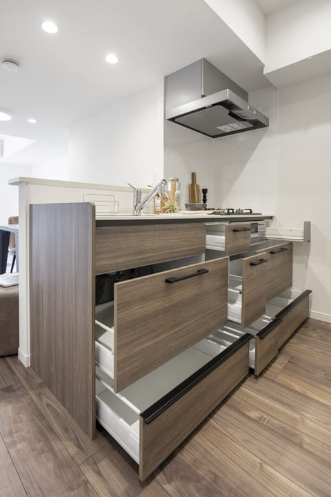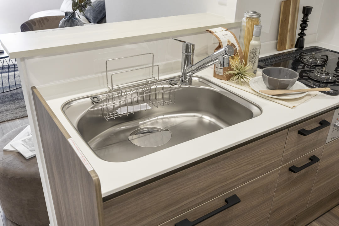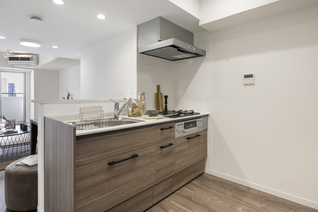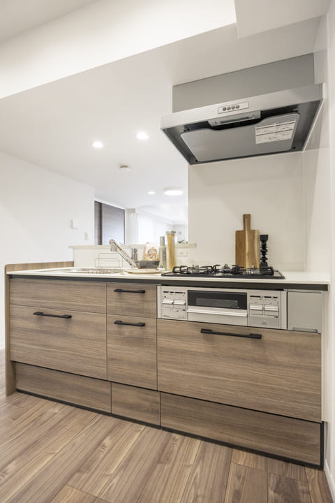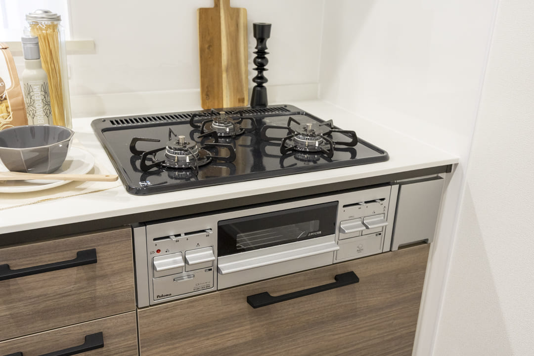 キッチンは、リビングダイニングを見渡しながら料理ができる対面式です。家族やゲストともコミュニケーションが取りやすくて◎。高めの腰壁が造られており、さりげなく手元を隠してくれるのも嬉しいですね。さらに、コンロ側には壁がたっており、油跳ねなどの心配はありません。3口コンロ、グリル、浄水器付きで料理も快適に。