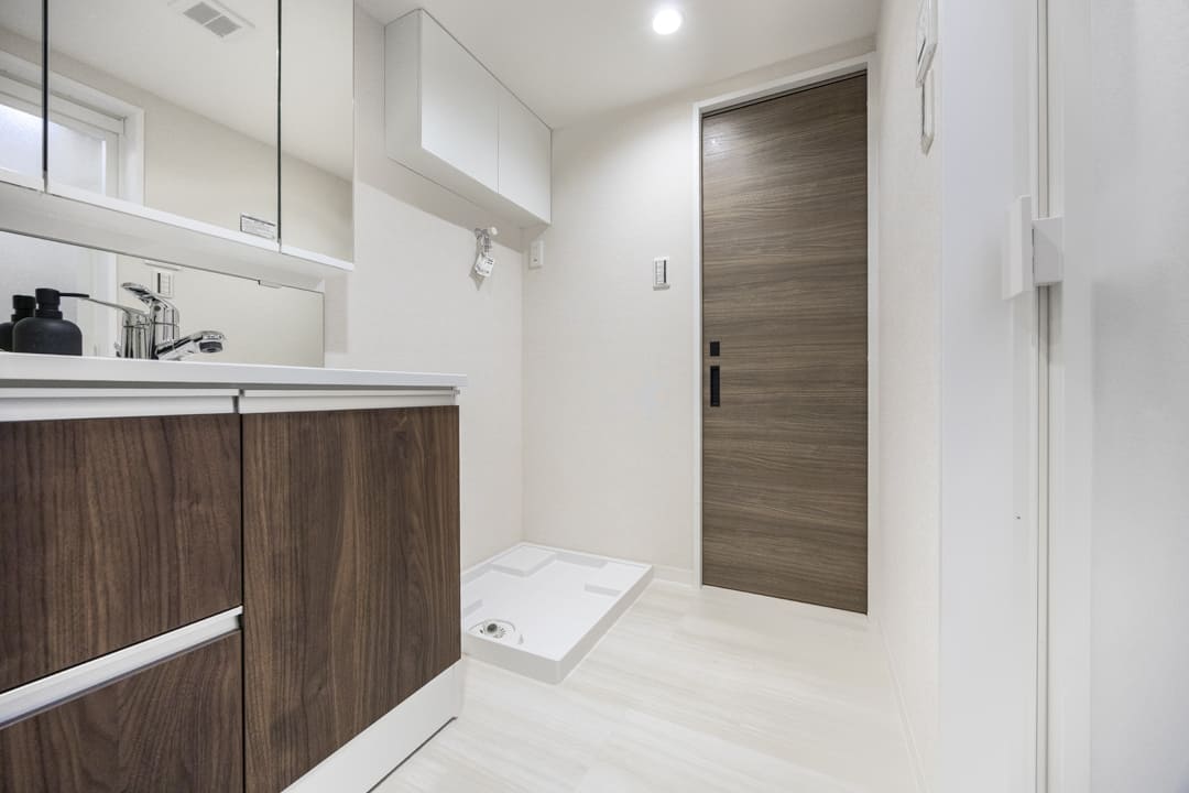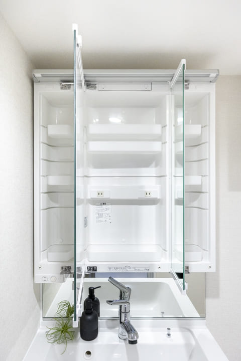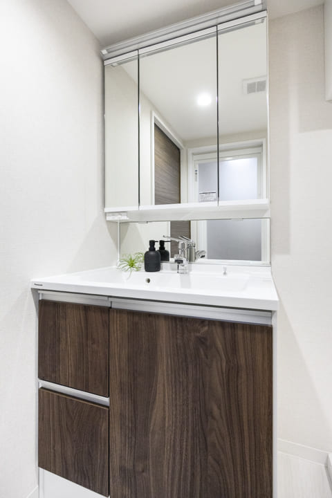 Panasonic製の洗面化粧台は、三面鏡の中に化粧品などが収納できて使い勝手良好。洗面ボウルとカウンターが一体型になっているため、お手入れも簡単です。