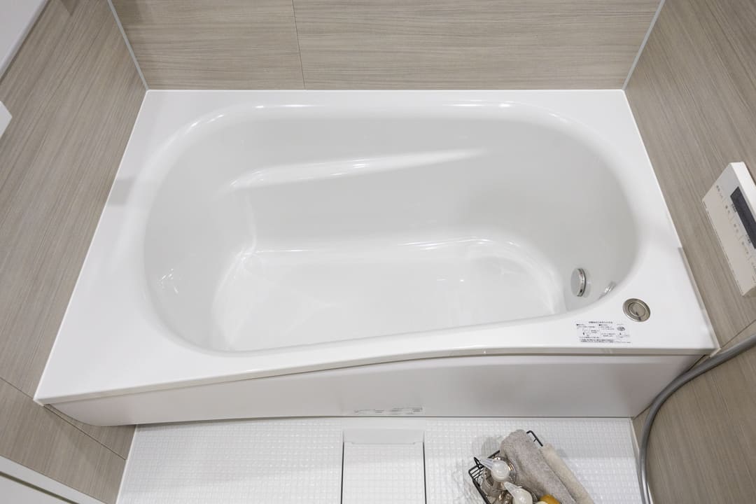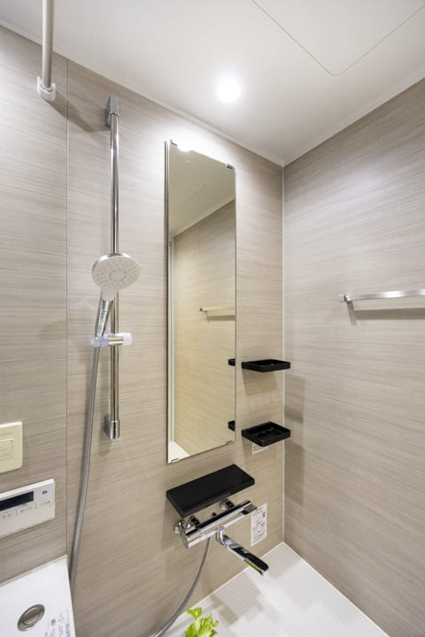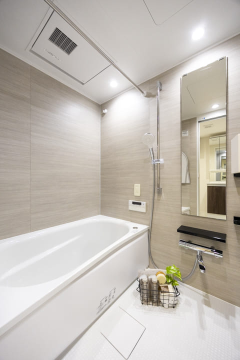 ブラウンの壁パネルが落ち着いた雰囲気を演出してくれている浴室です。お風呂にゆっくり浸かるのが好きという方に嬉しい追い焚き機能を搭載。浴室乾燥機には暖房・乾燥・換気・涼風の機能がついており、一年中快適に過ごすことができます。