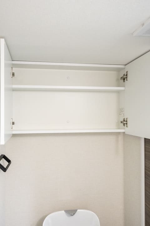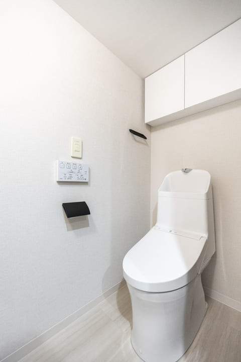 ウォシュレット一体型トイレです。上部には吊戸棚を設置、また正面にもカウンター収納が造られているため、トイレットペーパーや掃除用具などもすっきりと収納できそうです。