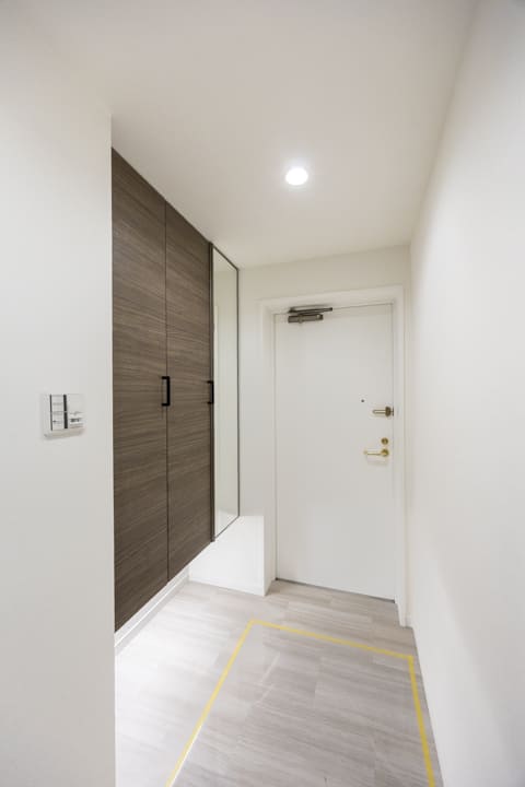 玄関入って右側にはシューズボックスが備え付けられています。フロートタイプのため空間に圧迫感を与えず、フットライトの光が優しく足元を照らしてくれますよ。また、扉面には鏡が設置されているので、出かける際に全身のコーディネートをチェックすることが