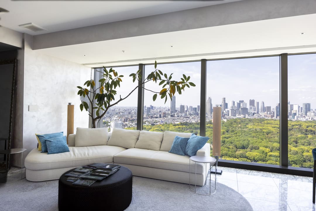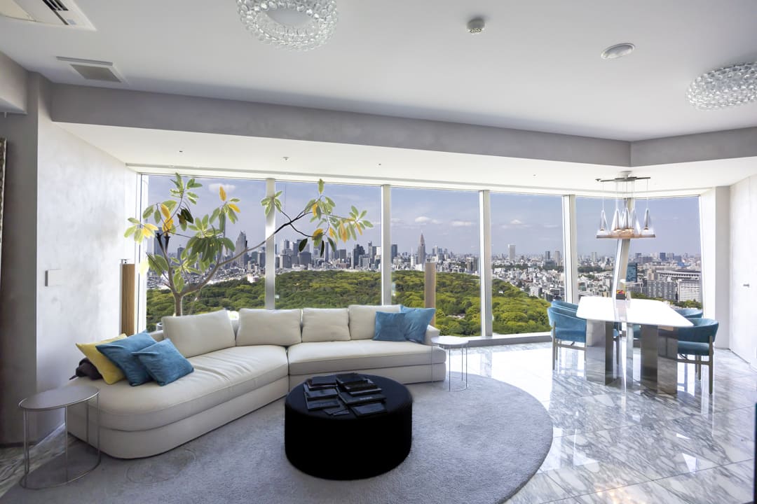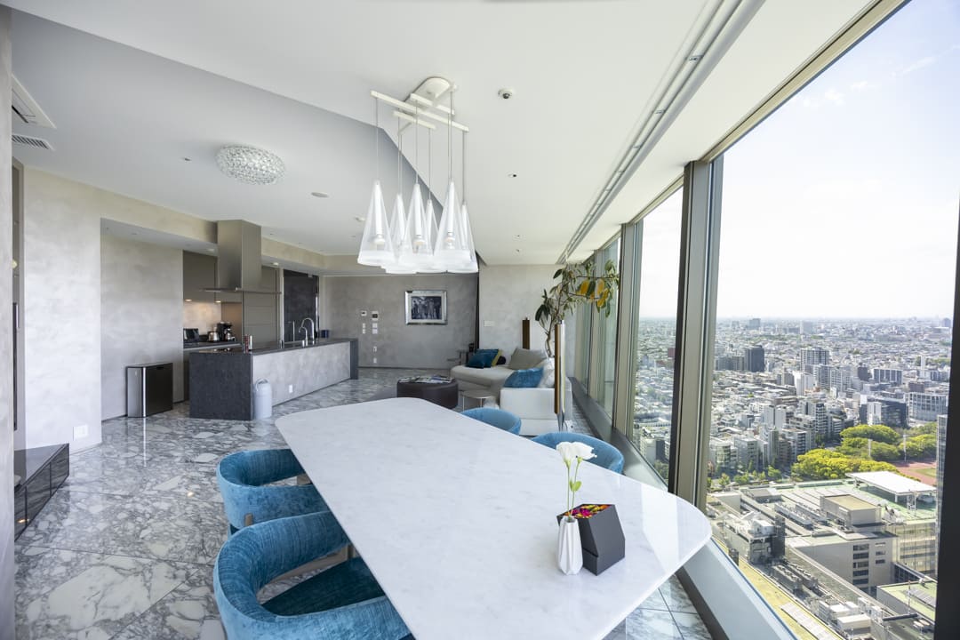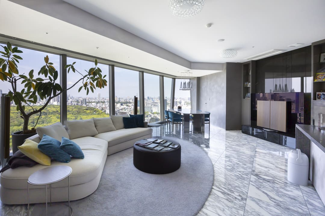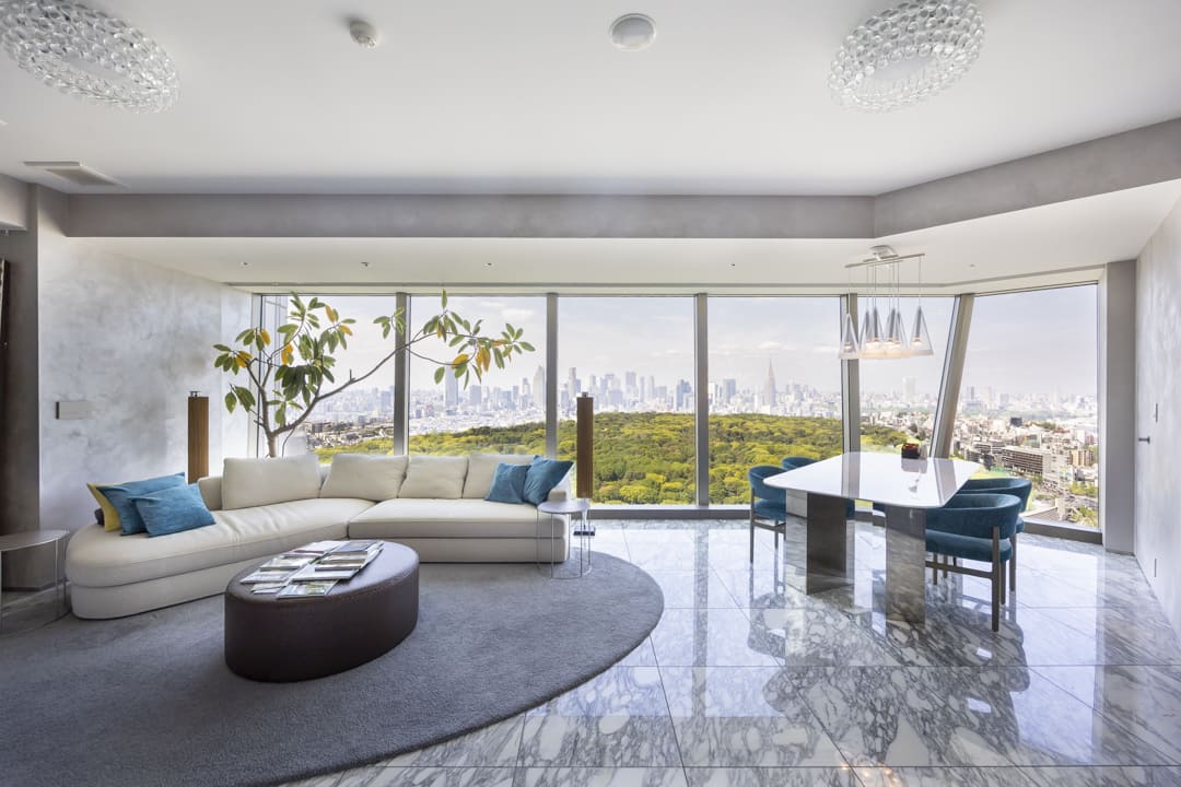 約34.0帖のゆとりあるリビングダイニング。最高天井高2700mmを確保した伸びやかな空間に、石柄フロアが上質な雰囲気を添えます。北側には大開口の窓が連なり、代々木公園の広大な緑と都心の街並みを一望。まるで一幅の絵画のような景色が日常に寄り添い、時間の移ろいとともに多彩な表情をお楽しみいただけます。開放感に満ちた空間で、穏やかで贅沢なひとときをお過ごしください。