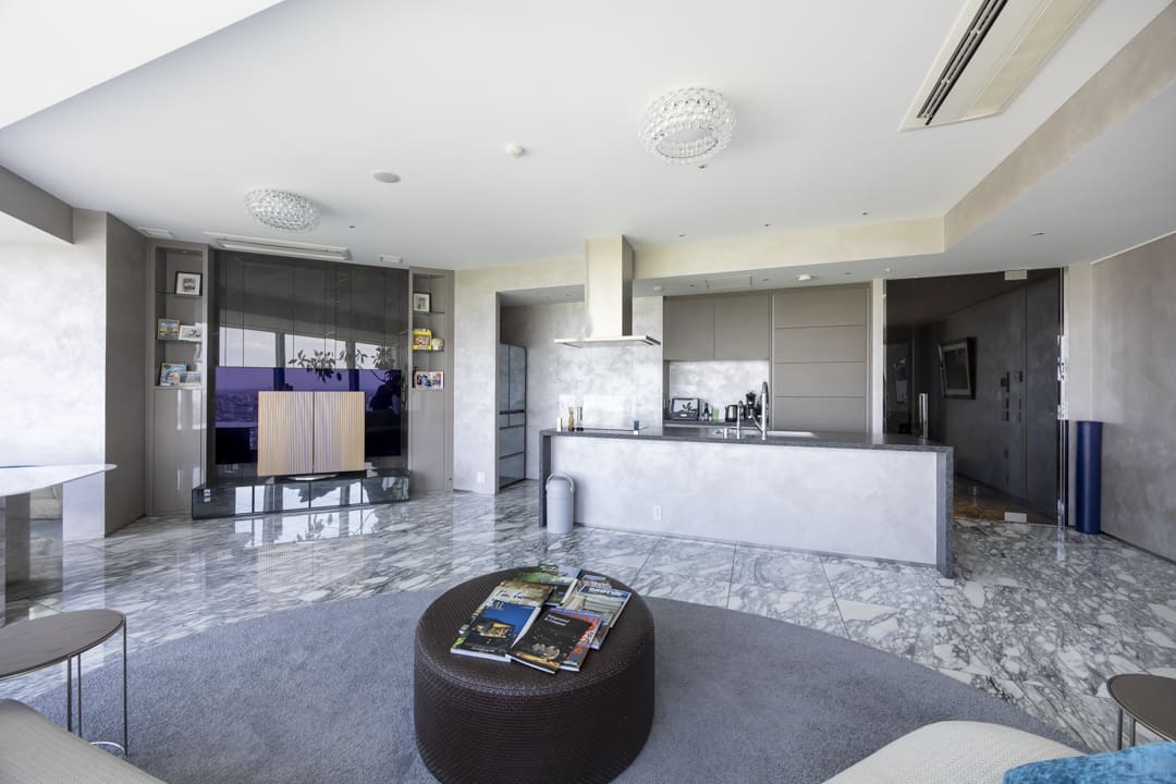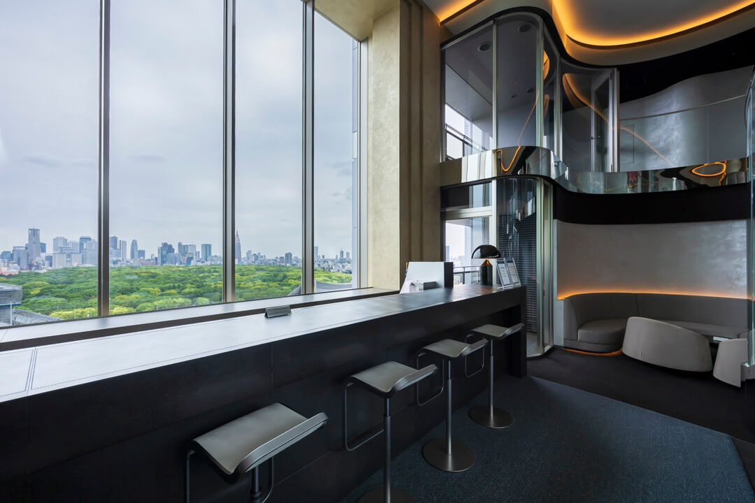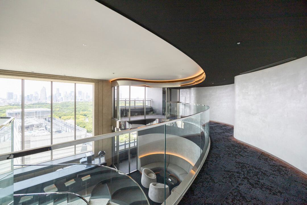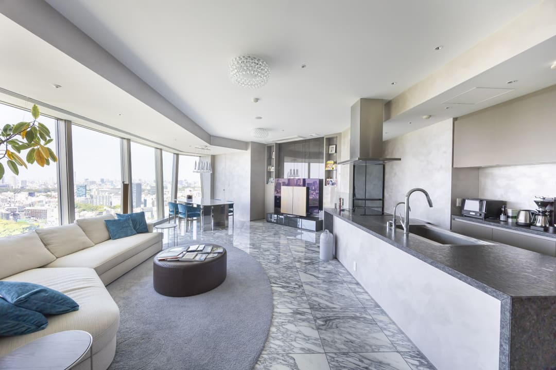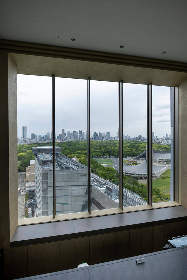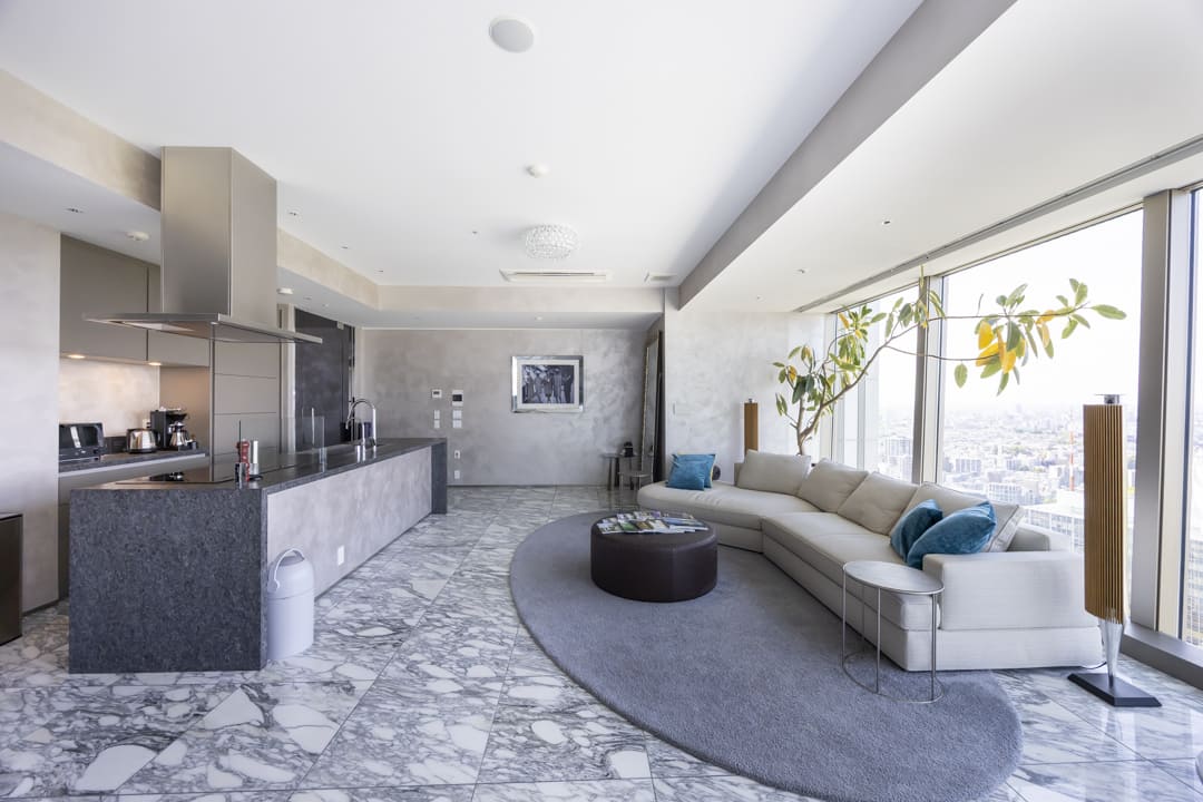約34.0帖のゆとりあるリビングダイニング。最高天井高2700mmを確保した伸びやかな空間に、石柄フロアが上質な雰囲気を添えます。北側には大開口の窓が連なり、代々木公園の広大な緑と都心の街並みを一望。まるで一幅の絵画のような景色が日常に寄り添い、時間の移ろいとともに多彩な表情をお楽しみいただけます。開放感に満ちた空間で、穏やかで贅沢なひとときをお過ごしください。