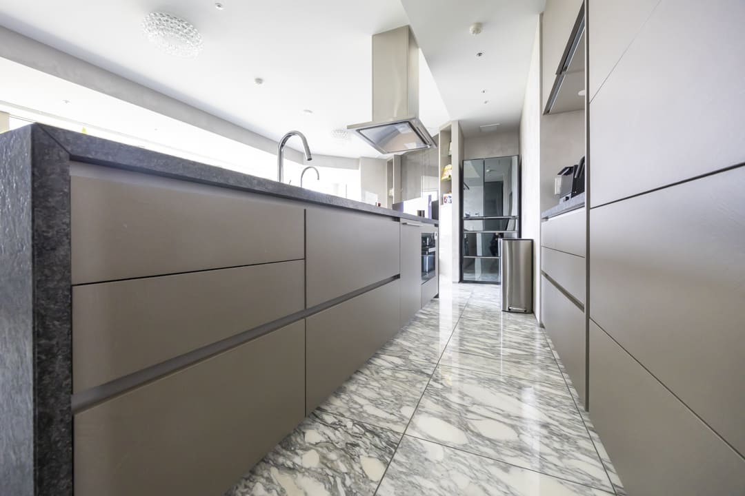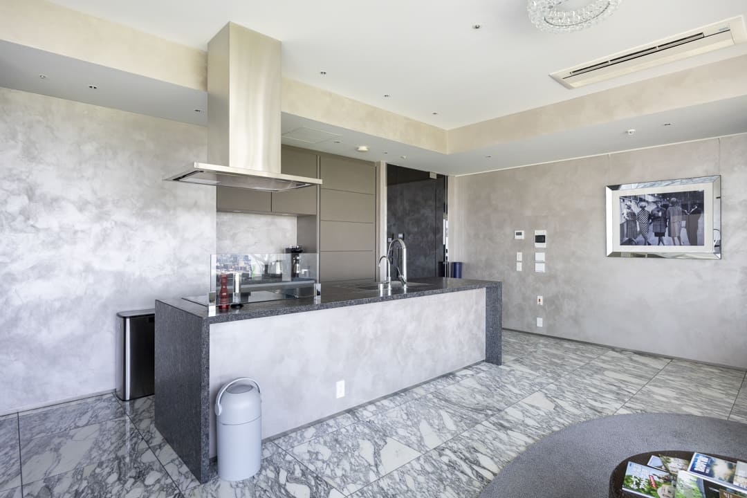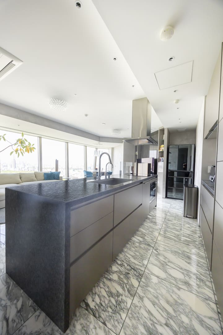 石目調のデザインが空間に美しく調和する、上質なキッチン。約5.2帖の広さを確保しています。左右から出入り可能なアイランドタイプを採用し、動線にも配慮された使い勝手の良い設計。ご家族での調理もゆとりをもってお楽しみいただけます。リビングダイニングを見渡せる開放的なレイアウトで、日常のひとときに自然なコミュニケーションが生まれます。