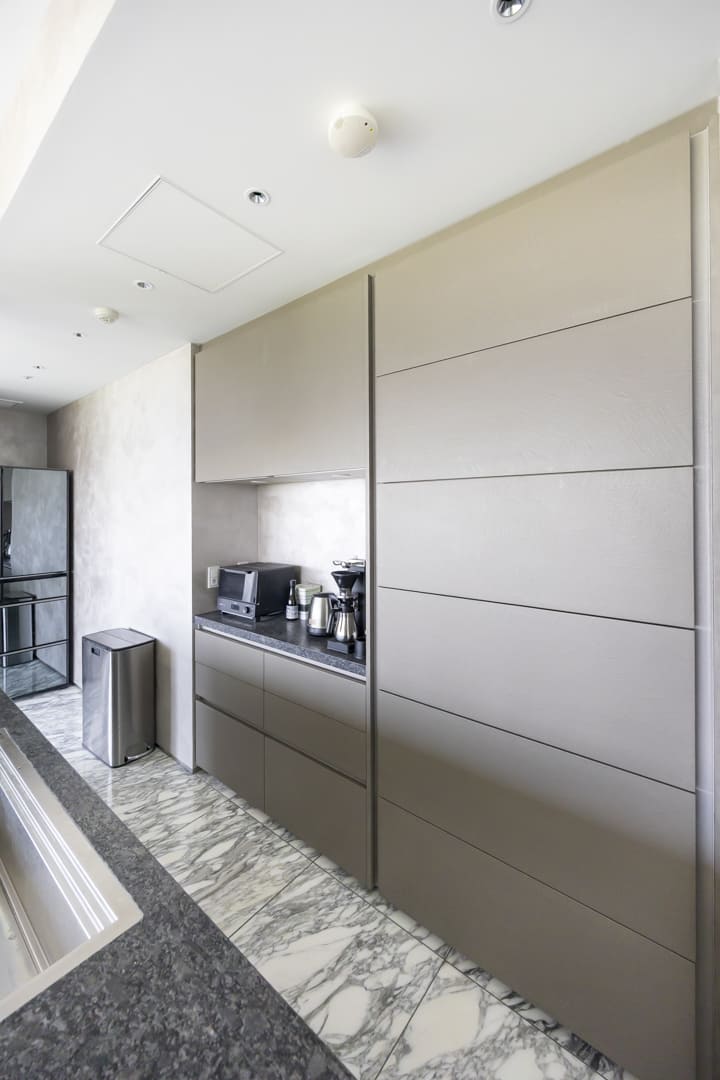 大容量のカップボードを備え、収納力の高さも魅力。食料品のストックや食器類をすっきり整頓でき、清潔なキッチン空間を保つことができます。カウンターは家電の設置や作業スペースとしても活躍し、機能性と美しさを兼ね備えたキッチン空間を実現しています。