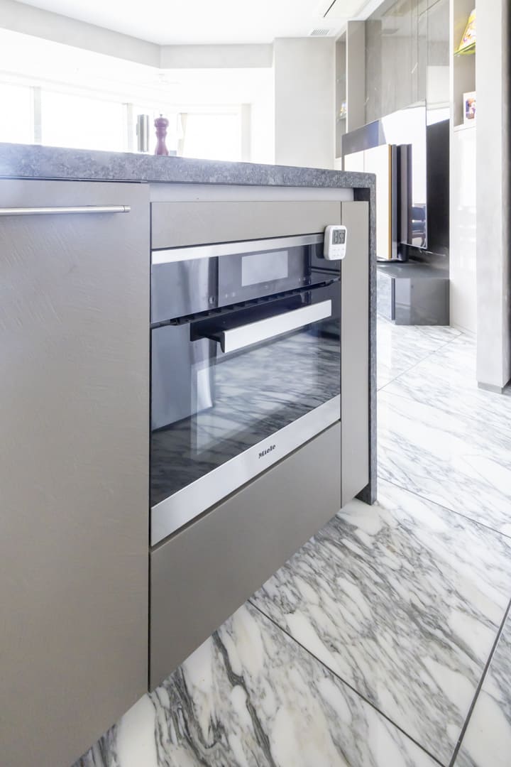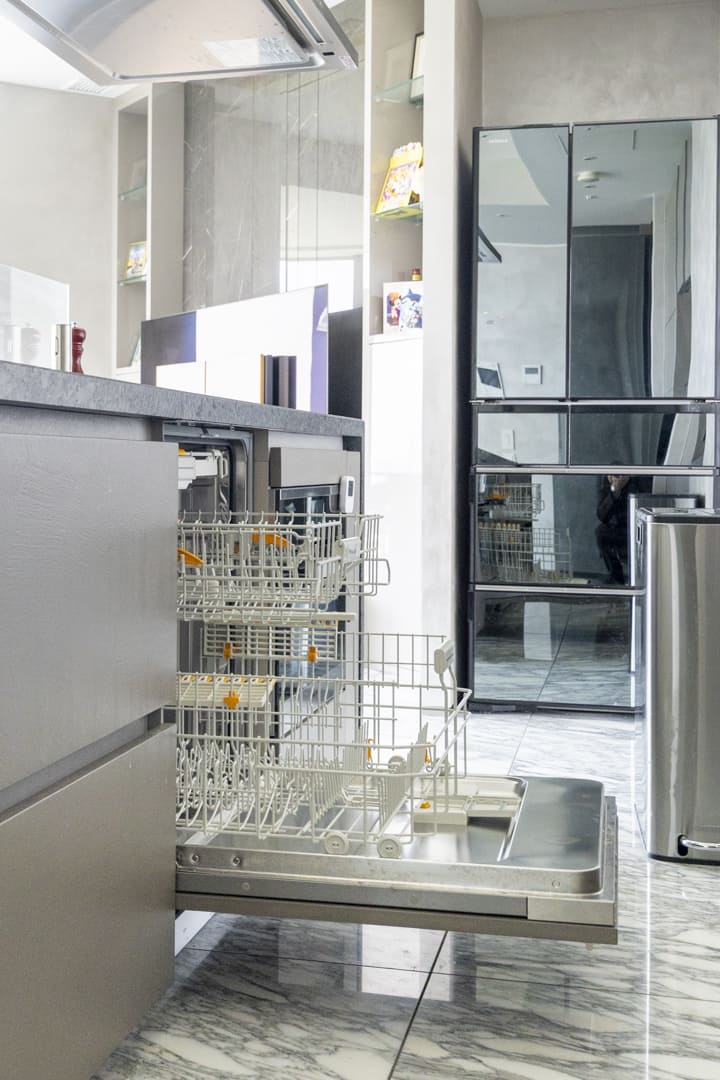 設備はドイツのプレミアム家電ブランド「Miele(ミーレ)」で統一。IHクッキングヒーター、ビルトインオーブン、食器洗浄機を内蔵しています。IHはフラットなガラストップでお手入れがしやすく、火力調整もスムーズ。スチームオーブンを活用すれば料理の幅も広がり、日々の食卓をより豊かなものにしてくれます。食洗機は大容量のフロントオープンタイプを採用しています。