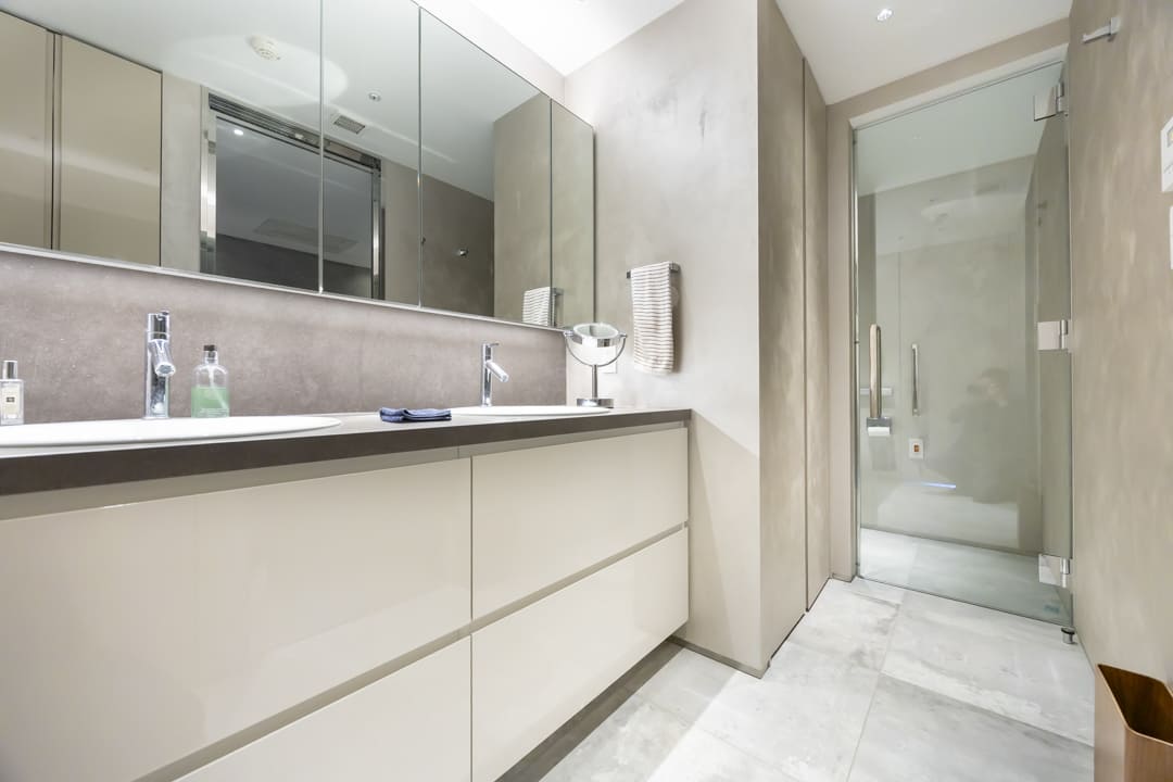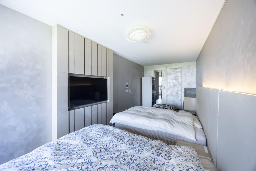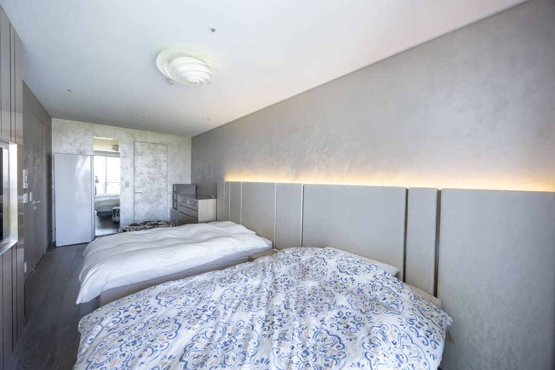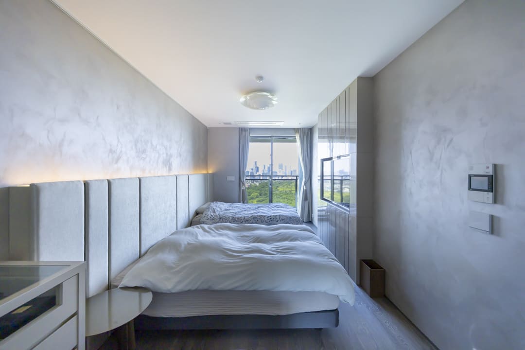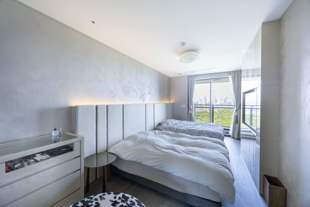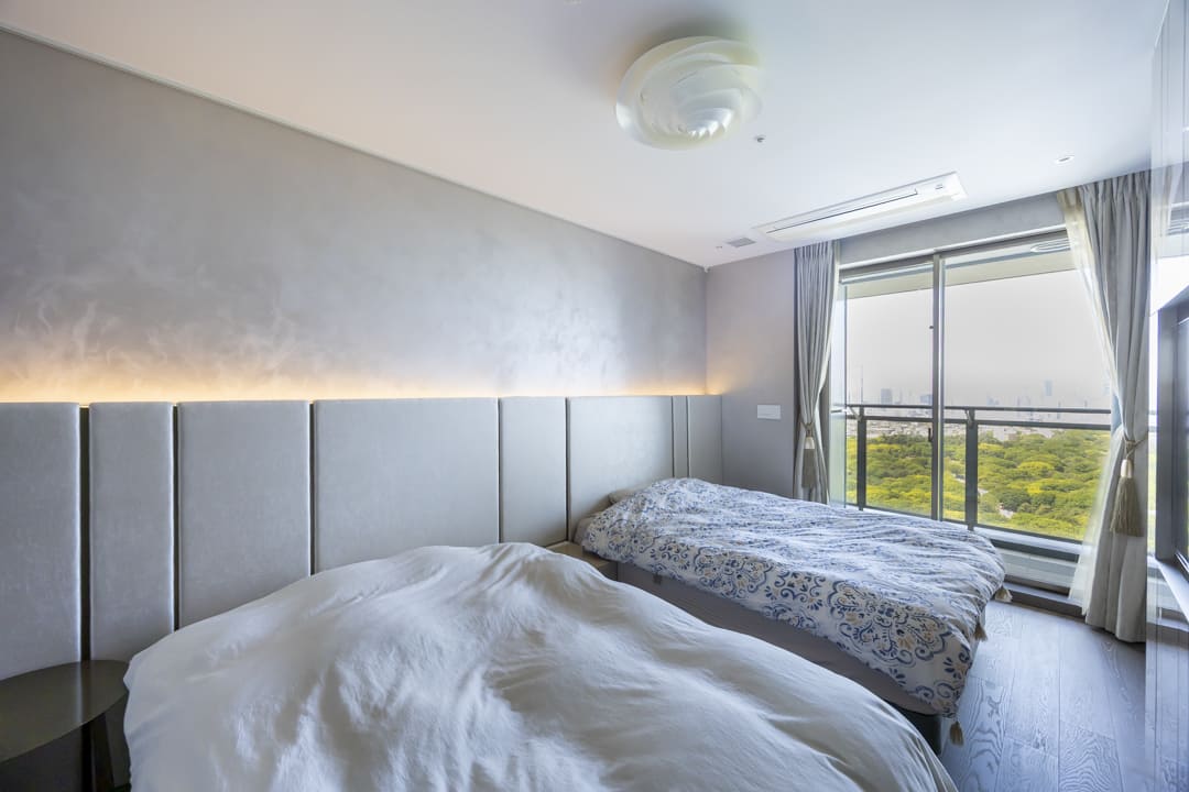 約13.0帖の広々とした主寝室。バルコニー窓から代々木公園の豊かな緑を望む、開放感溢れる一室です。全居室床暖房付きで寒い季節も快適に過ごせますよ。間接照明を備えたベッドボードがやわらかな光で空間を包み込み、夜は心安らぐひとときを演出。テレビは壁掛け設置が可能で、空間をすっきりと保ちながら、洗練された印象に仕上げられています。