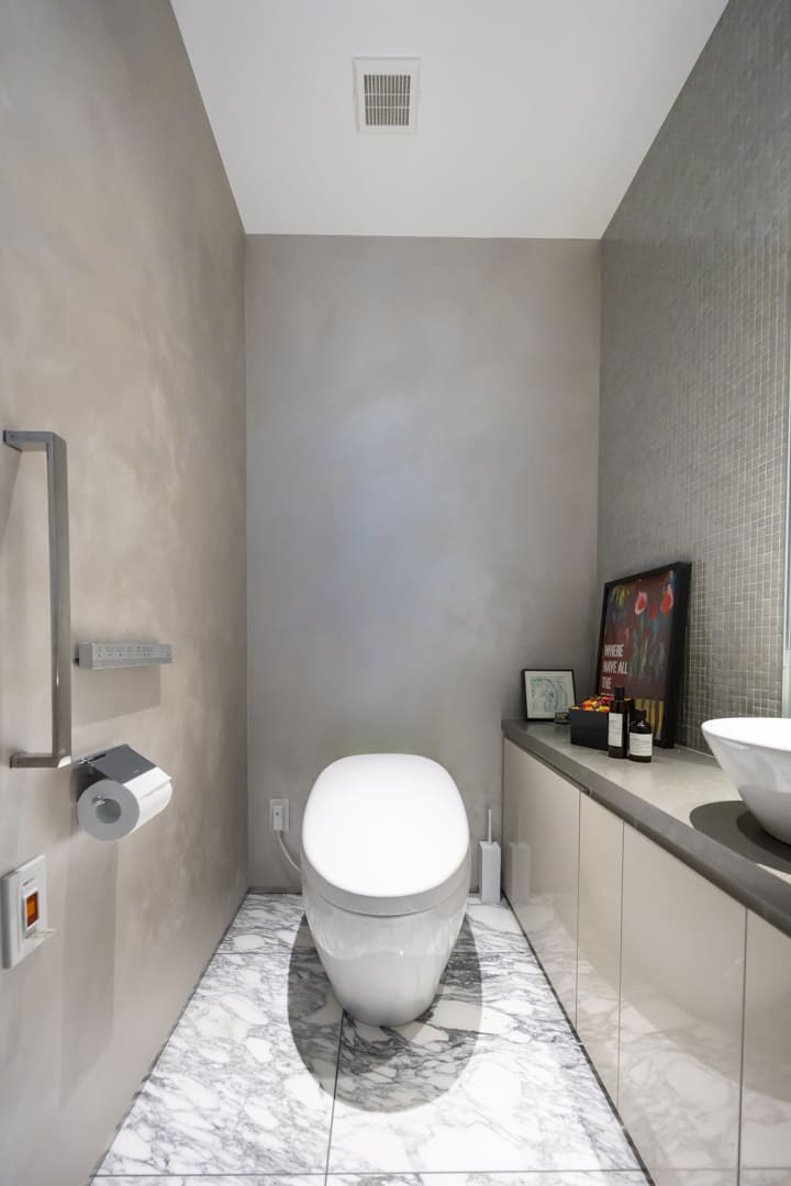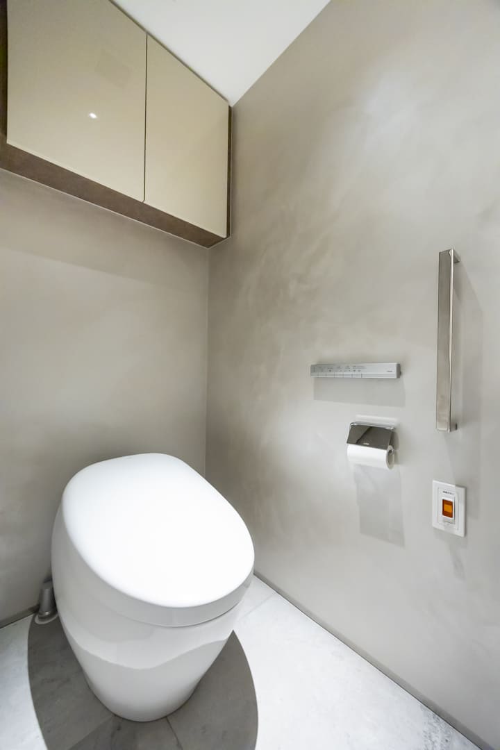 レストルームは2ヶ所に設けられ、シーンに応じた使い分けが可能です。洗面室内のトイレは、ご家族のプライベート用として。もう一方は玄関近くにあり、独立性の高い空間です。ミラー付きの手洗いカウンターを備え、来客時にもスマートにお使いいただけます。いずれもスタイリッシュなタンクレストイレを採用し、手洗いカウンター付きで機能性と意匠性を兼ね備えています。