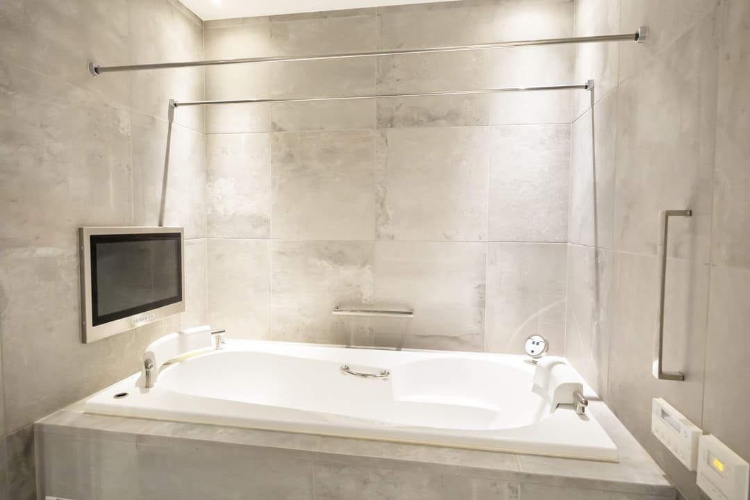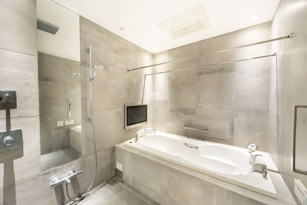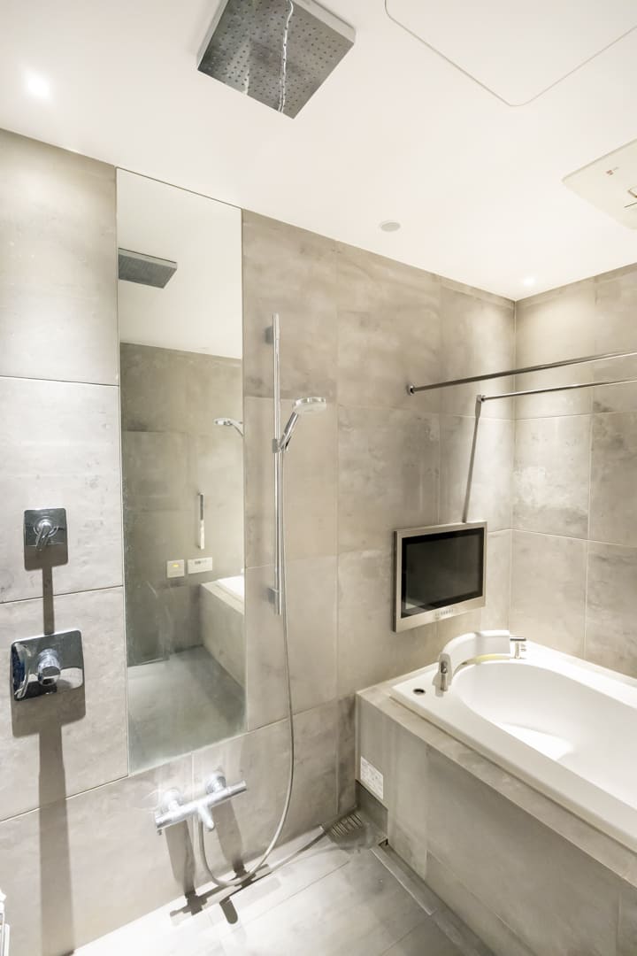 ゆったり入浴できる2024サイズのバスルーム。石目調のデザインやガラスドアが、上質で洗練された空間を演出します。浴室換気乾燥暖房機やミストサウナを備え、機能面も充実。さらにテレビも設置されており、湯に浸かりながら穏やかな寛ぎの時間をお楽しみいただけます。発汗によるリフレッシュやボディケアなど、日々の疲れをやさしく癒すバスタイムを叶えます。さらに、天井埋込式のオーバーヘッドシャワーを設置。全身でシャワーを浴びることができ、高い保温効果が期待できます。用途によってハンドシャワーとの使い分けができるのも便利です。