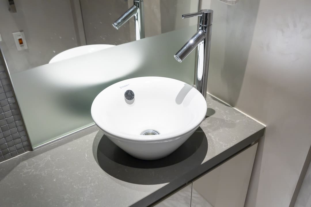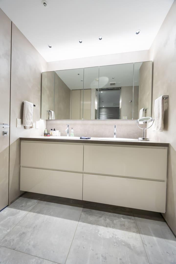 ホテルライクな2ボウル仕様の洗面化粧台を採用。2人並んでゆとりをもって身支度ができ、忙しい朝の時間にも余裕が生まれます。ミラーボックスや足元の引き出しに加え、リネン庫も備えた豊富な収納により、空間をすっきりと保つことが可能です。また、洗濯機置き場には扉を設け、生活感をさりげなく抑えた落ち着きのある洗面室に仕上げられています。