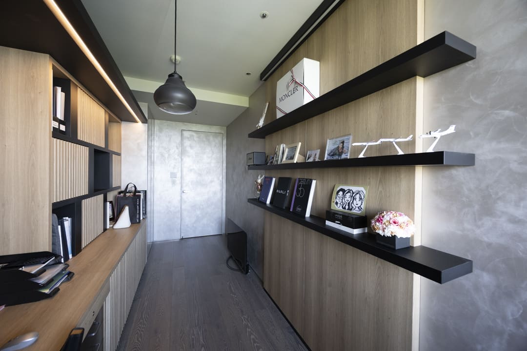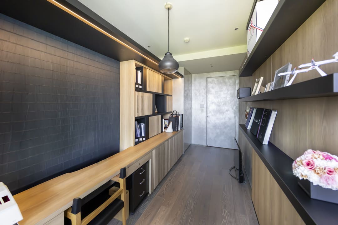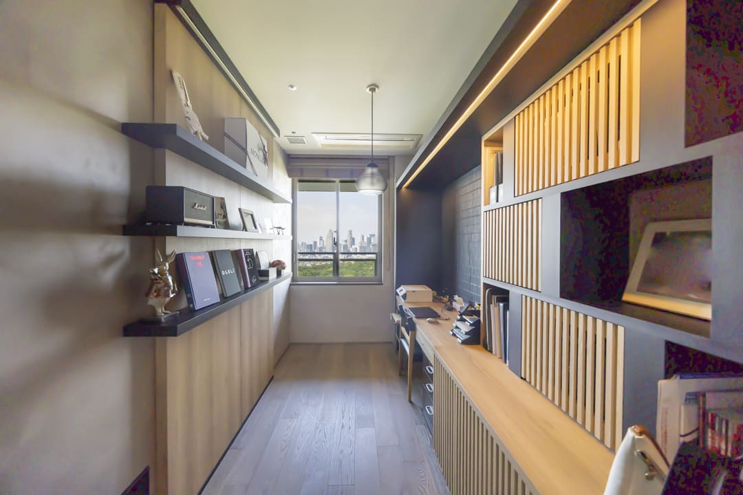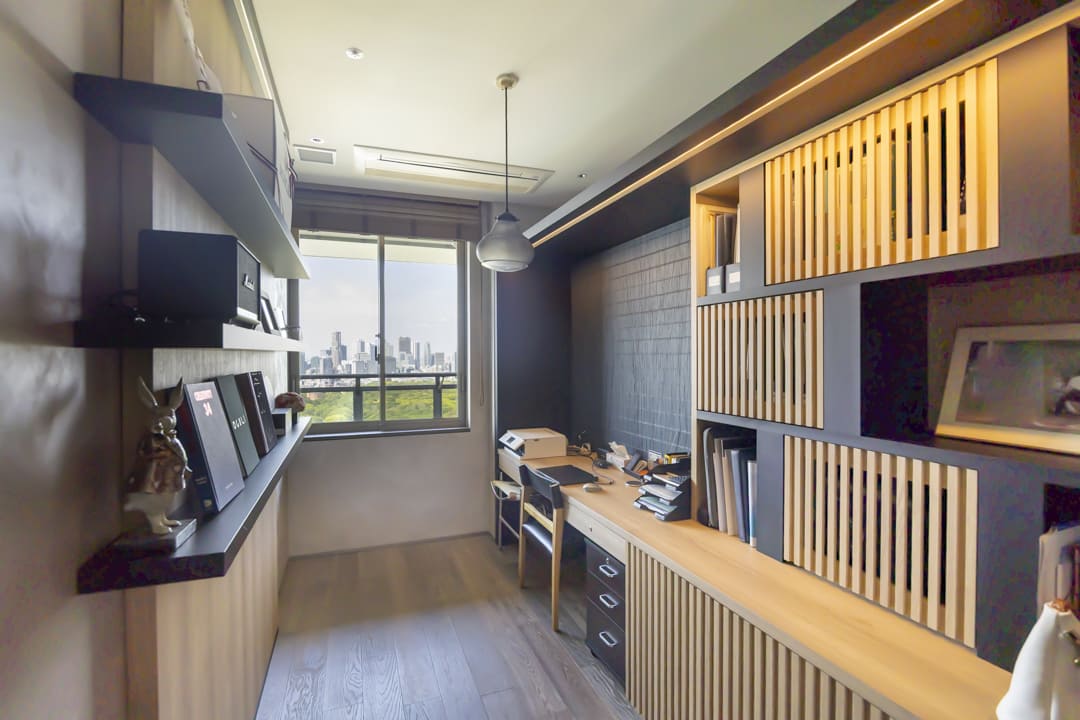 2部屋の寝室はいずれもバルコニーに面し、窓の先には青空と木々の緑を望むことができます。こちらのお部屋には、デスクカウンターとウォールシェルフを造り付けており、リモートワークや学習の場としても快適にお使いいただけます。格子デザインの収納が空間にリズムをもたらし、見せる収納を楽しみながら、自分らしい空間づくりを叶えられる点も魅力です。