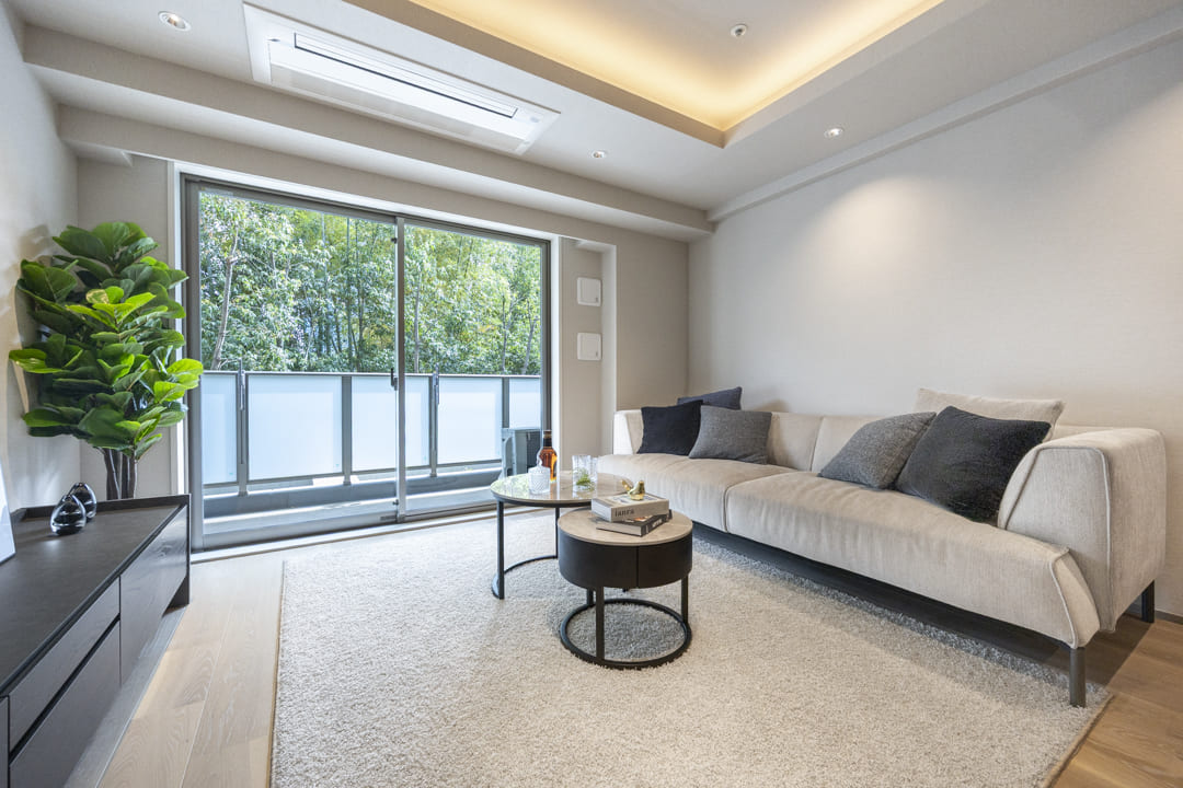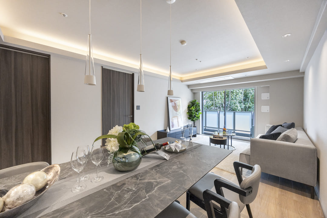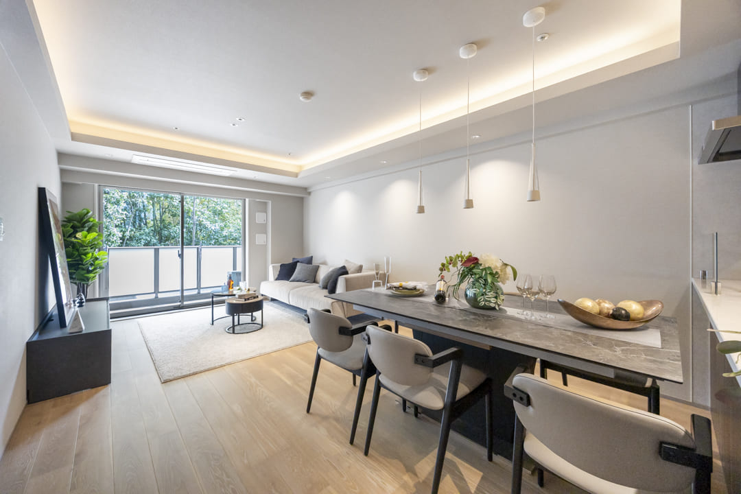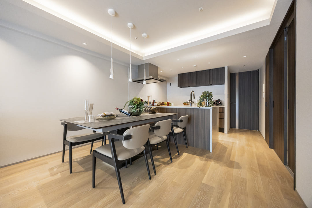 南向きの大きな窓から心地よい陽光が降り注ぐ、明るいリビングダイニング。窓越しに望む豊かな緑が、都心に居ながらにして四季の移ろいを感じさせてくれます。キッチンを含め約18.1帖のゆとりある広さを確保しており、ご家族での団らんはもちろん、ゲストを招いてのひとときもゆったりと過ごせる、開放感に満ちた住まいの中心です。