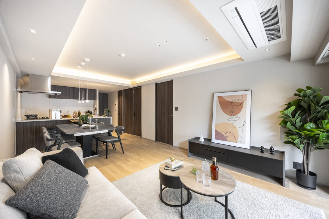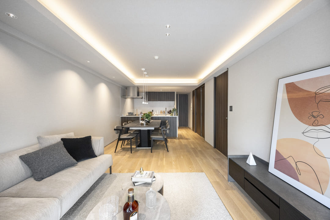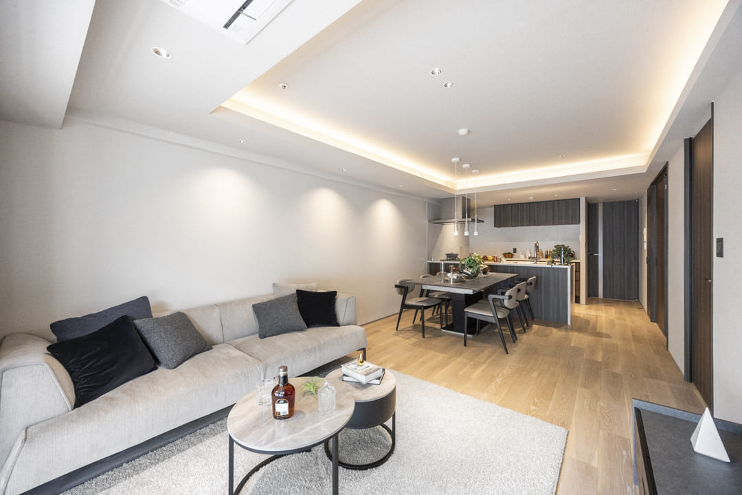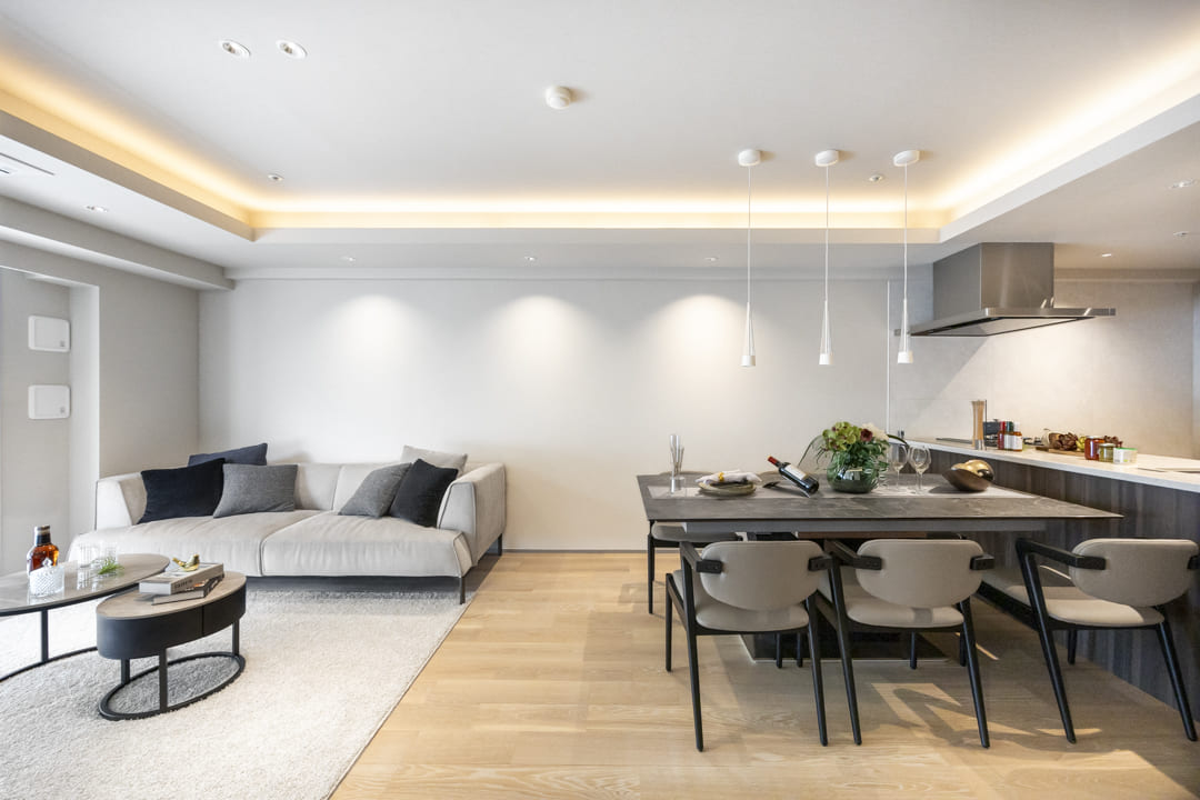 木目の美しさが際立つフローリングを採用した、ナチュラルで洗練された内装。天井の間接照明が柔らかな陰影を創り出し、空間全体に穏やかで上品な雰囲気をもたらします。どんな家具とも調和しやすいニュートラルな色調のため、北欧やモダン、シンプルなど、お好みのスタイルで自分らしいインテリアコーディネートを楽しめます。