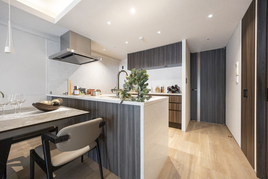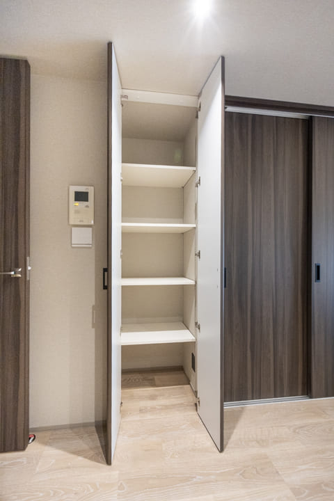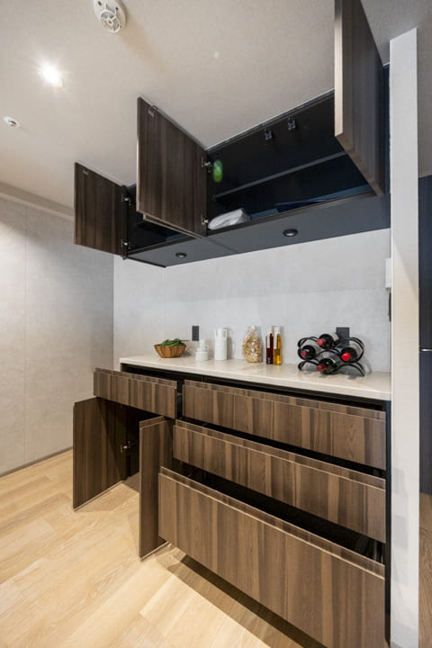 キッチン側には、収納物に合わせて高さを調節できる自由度の高い可動棚を完備。生活用品や書類から、お気に入りのインテリア小物まで効率よく整理できます。扉付きのデザインを採用しているため、生活感を感じさせず、洗練された室内の美しさをそのままに保てるのが大きな魅力です。