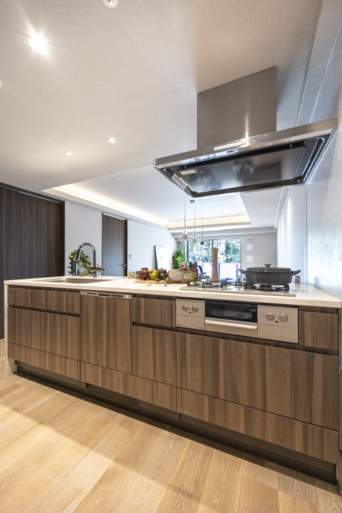 木目デザインが空間に美しく溶け込む、洗練されたキッチン。リビングを見渡しながら調理ができる対面タイプを採用しており、家族との会話を楽しみながら、日常のコミュニケーションをより豊かに育みます。コンロ前にはクリアなガラスガードを設置。視界を遮らずに油跳ねをガードできるため、リビングの清潔感を保ちながら開放的に家事を行えます。