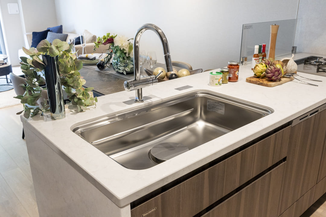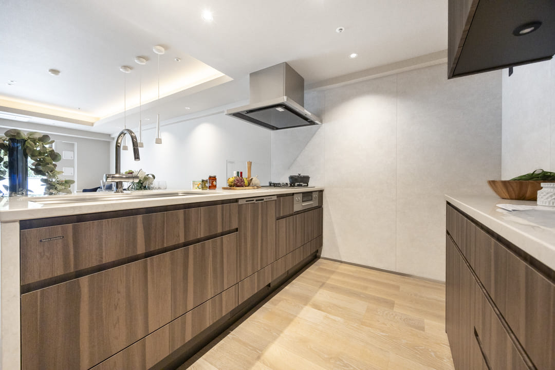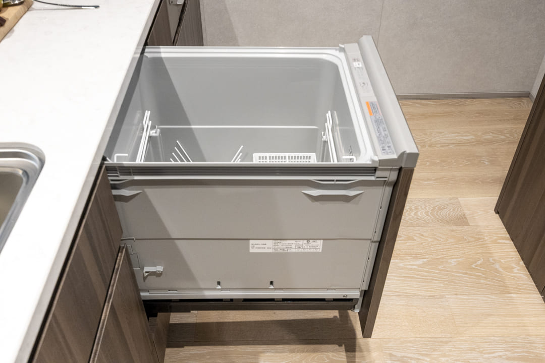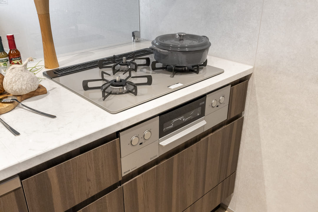 効率良く調理ができるグリル付3口ガスコンロを搭載。火力を活かした多彩な料理をスムーズに楽しめます。さらに、後片付けの負担を軽減する食洗機も内蔵。節水効果はもちろん、家事の時間を短縮することで、食後のひとときをよりゆったりと過ごせるゆとりを生み出します。