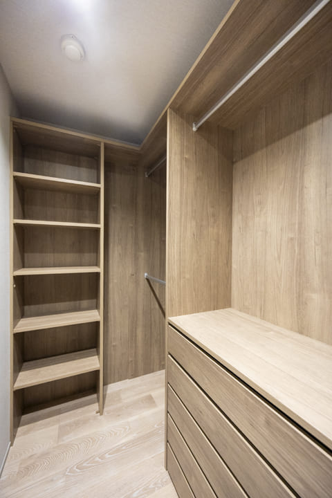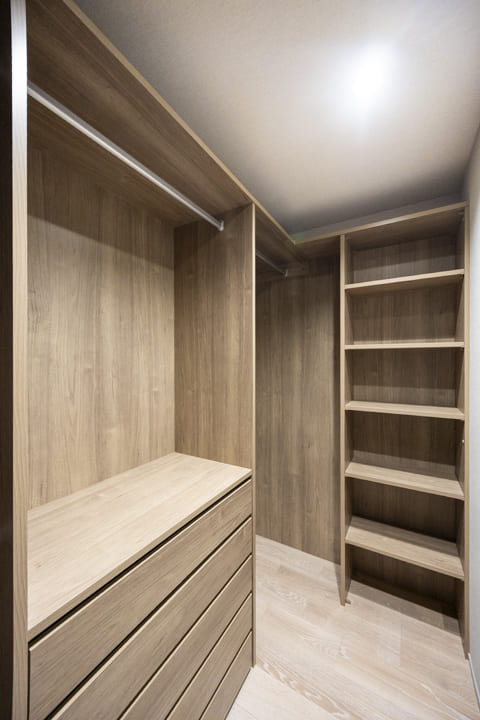 約7.1帖の主寝室。LDKから離れた配置により独立性が高く、プライベートな時間を穏やかに過ごせます。天井に配された間接照明の柔らかな光が、空間に奥行きと上質感を演出。ハンガーパイプや可動棚、引き出しを設けた多機能なWIC(ウォークインクローゼット)を備えているため、衣類から小物まで美しく整頓でき、居室空間をより広々と有効活用いただけます。