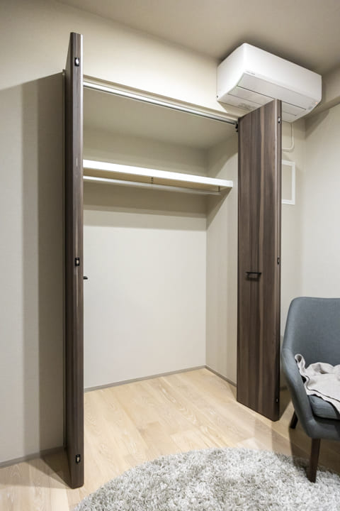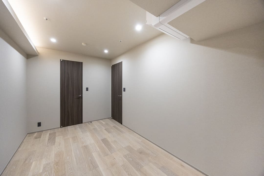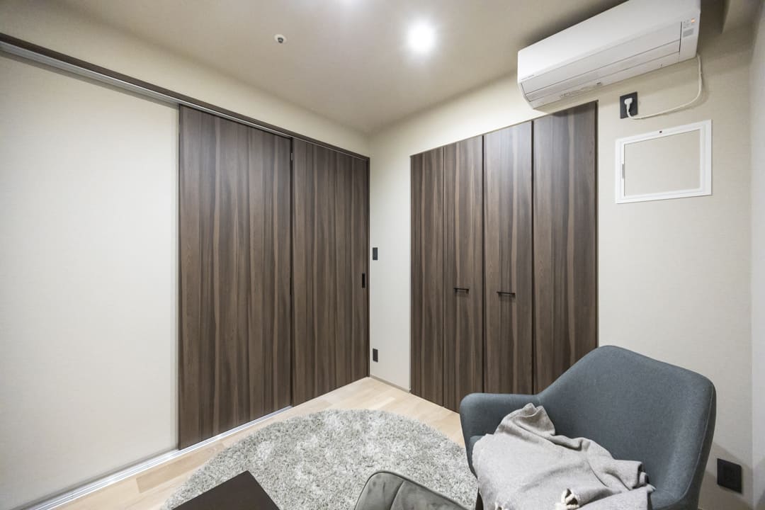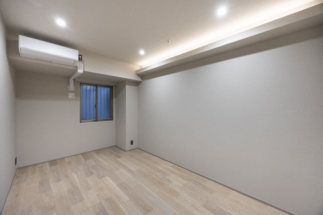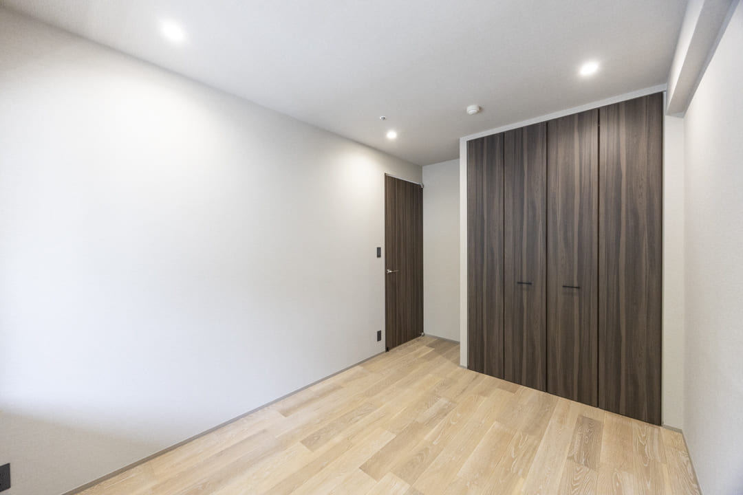 約6.0帖の寝室1。廊下から直接アクセスできる配置により、独立性が高く落ち着いて過ごせる空間です。共用部に面した窓と、4枚折れ戸のクローゼットを完備。開口部が大きく、大きな荷物もスムーズに出し入れ可能です。天井の間接照明が優しく灯り、心地よいリラックスタイムを演出します。