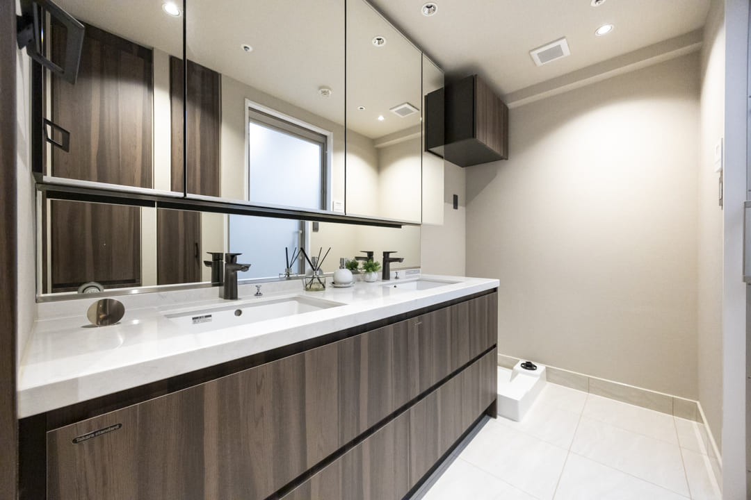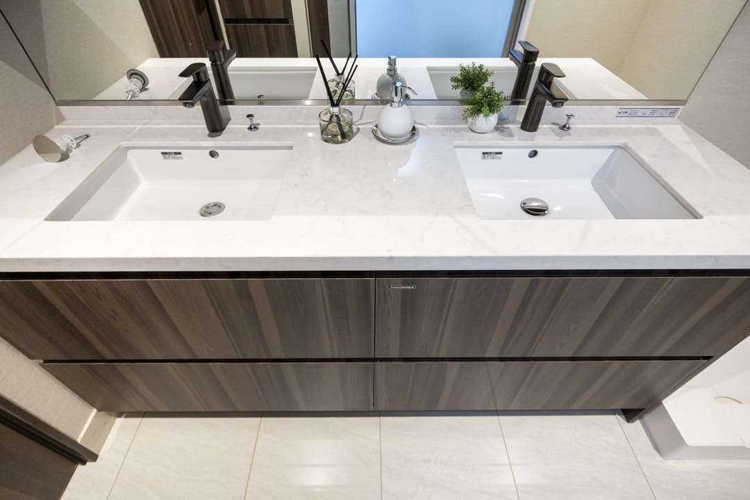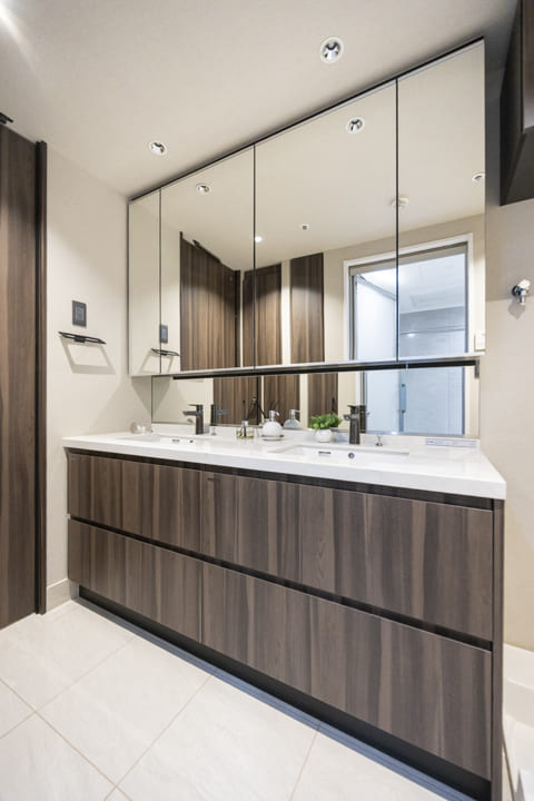 2つの洗面ボウルが並ぶ、ゆとりある洗面化粧台。2人同時に使用でき、忙しい朝の身支度も落ち着いて行うことができます。大容量のミラーボックスには洗面まわりの小物をすっきり収納可能。2つのリネン庫も備え、いつも清潔な洗面室を保つことができます。