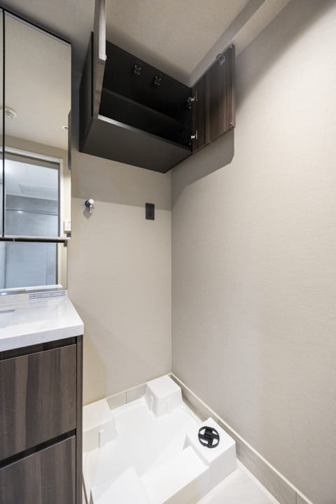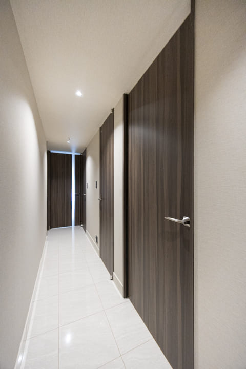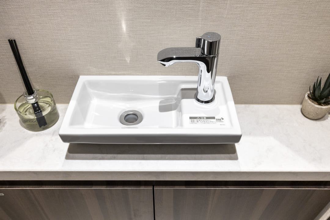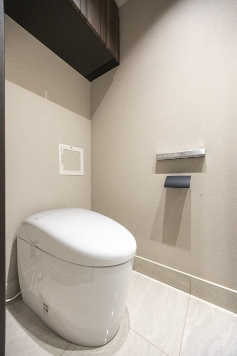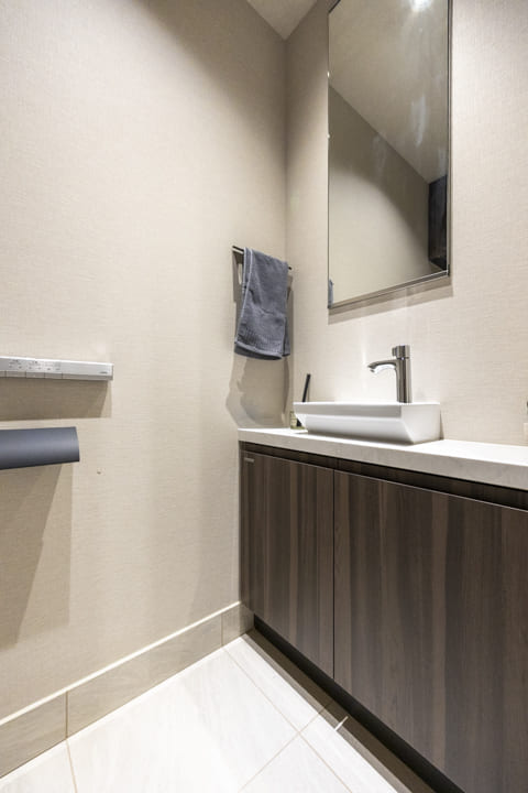 廊下に面し、独立性に配慮されたレストルーム。タンクレス仕様のスタイリッシュなトイレを採用し、空間全体をすっきりと美しく整えています。ミラー付きの手洗いカウンターを備え、来客時にもスマートにお使いいただける仕様。身だしなみを整えるひとときにも配慮された、ホテルライクな空間です。吊戸棚にはトイレットペーパーや掃除用品を収納でき、生活感を抑えた端正な印象を保ちます。